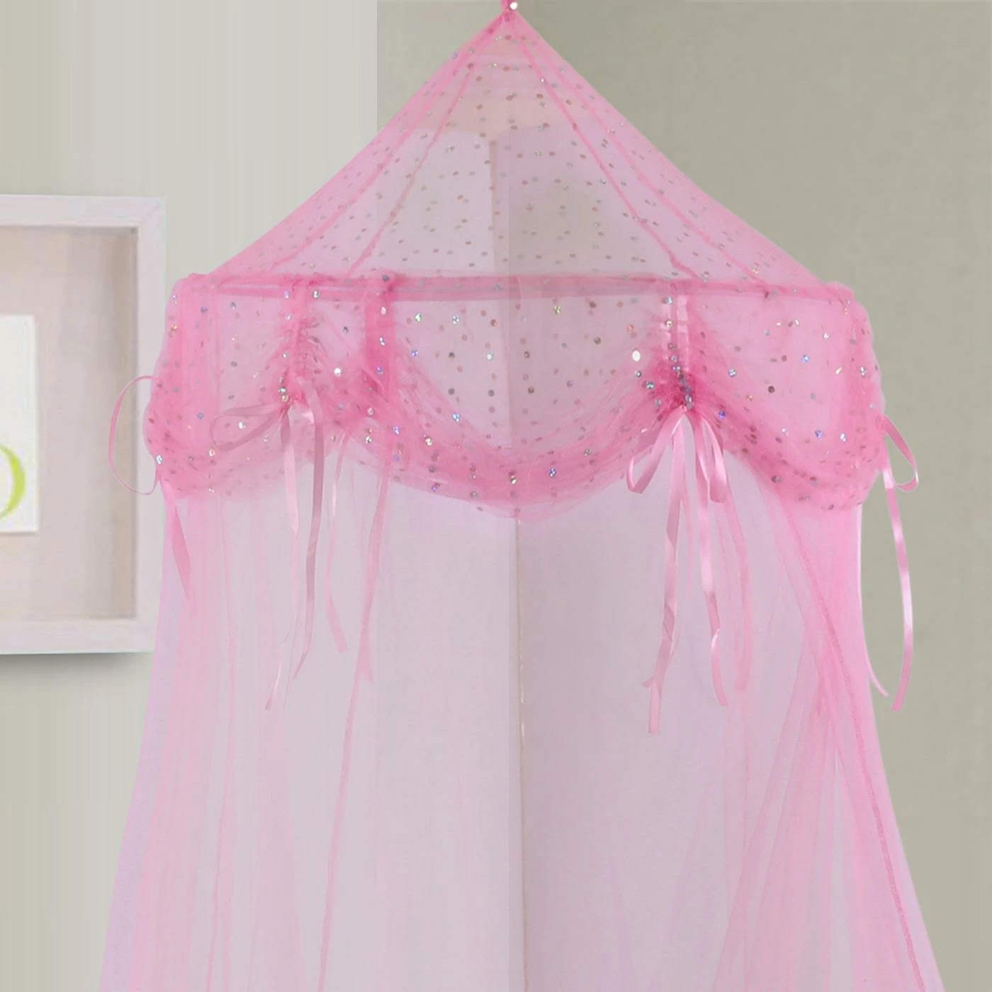 Make your child feel like royalty by adding this Epoch Hometex Buttons and Bows Kids Collapsible Hoop Sheer Bed Canopy over their bed. This sheer pink polyester canopy features glittery top material that is elegantly gathered and tied up with satiny ribbon. It fits twin, bunk, full, and queen bed sizes.