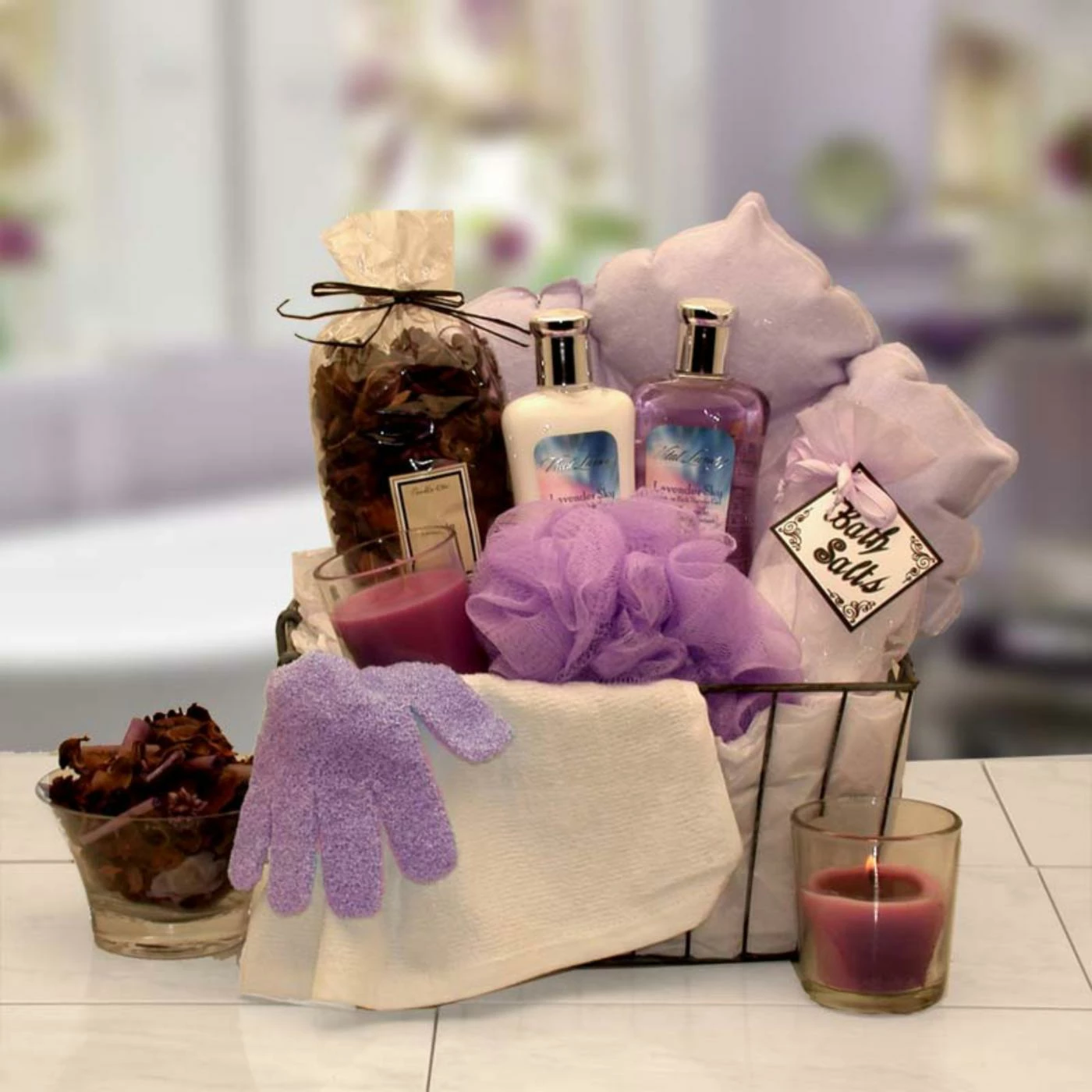 Wire-handled bath caddy, Bath loofah, 3-inch Pillar candle, Lavender potpourri, Relax & Read bath pillow, Heavenly Moments 8 oz. lavender moisturizing bath gel, Heavenly Moments 8 oz. lavender moisturizing body lotion, Exfoliating bath mitt, Microfiber facial towel, Bath salt crystals