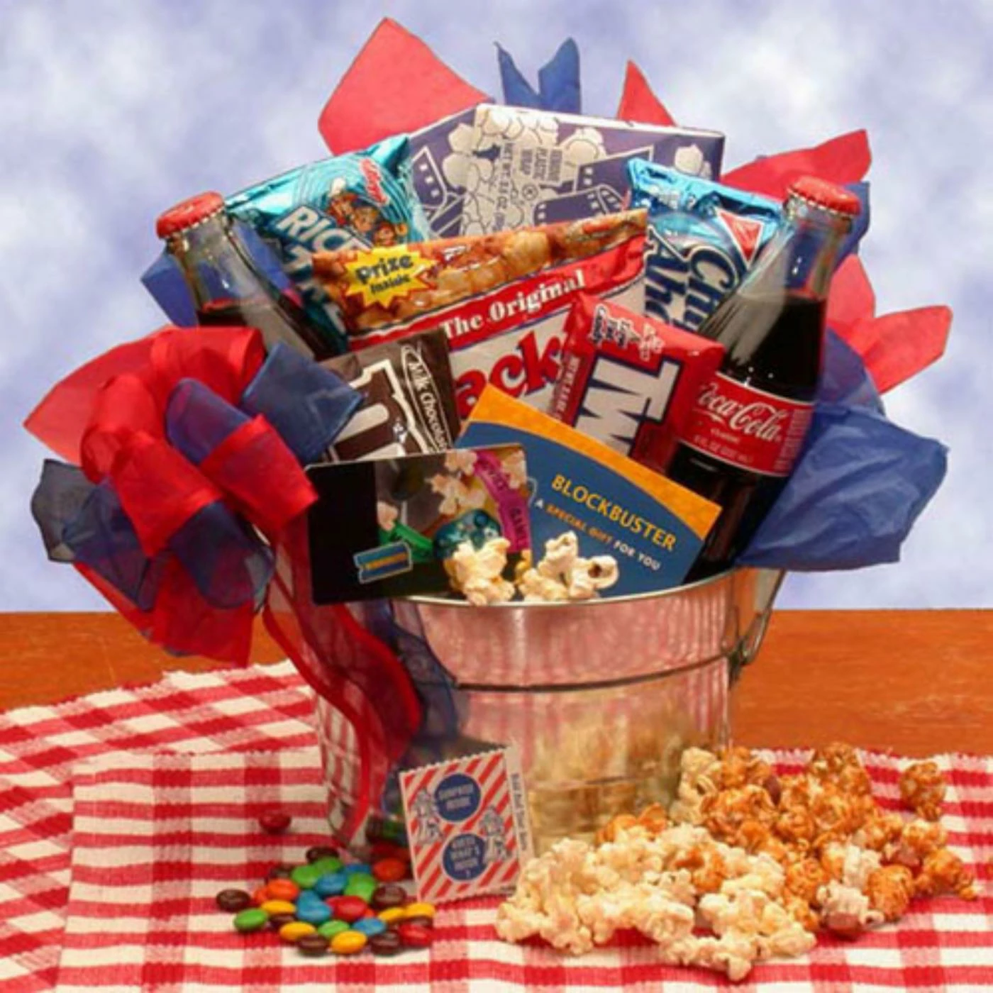 The Blockbuster Night Movie Gift Pail will treat the family to all their favorite snacks, best enjoyed while watching a great movie from Blockbuster. Packaged in a 10-in metal pail and brightened up with red and blue tissue paper, the Blockbuster Night Movie Gift Pail is a blockbuster hit!
