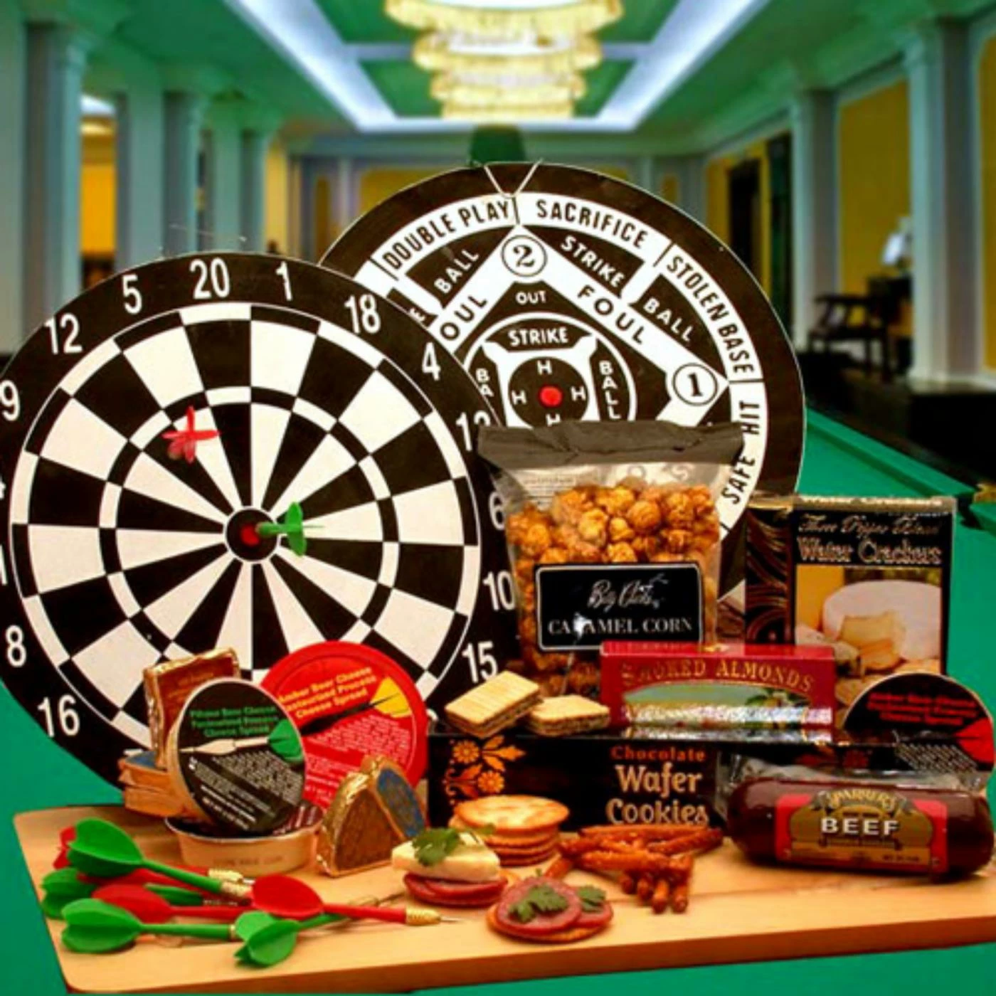 Hit The bullseye with this unique and exclusive Bullseye Deluxe Gift Set. It is filled to the point of overflowing with delicious sweet and savory treats. Included in this set is a two-in-one 14-inch dart board, six darts, three assorted beer cheeses, six assorted cheese wedges, chocolate wafer cookies, 2 oz. smoked almonds, 1 ounce stone wheat water crackers, 5 oz. crunchy caramel corn, and 3 oz. smoky beef salami. This party starter is perfect for housewarming events, or any occasion. When the snacks are done, use the fully functional dart board for game time.
