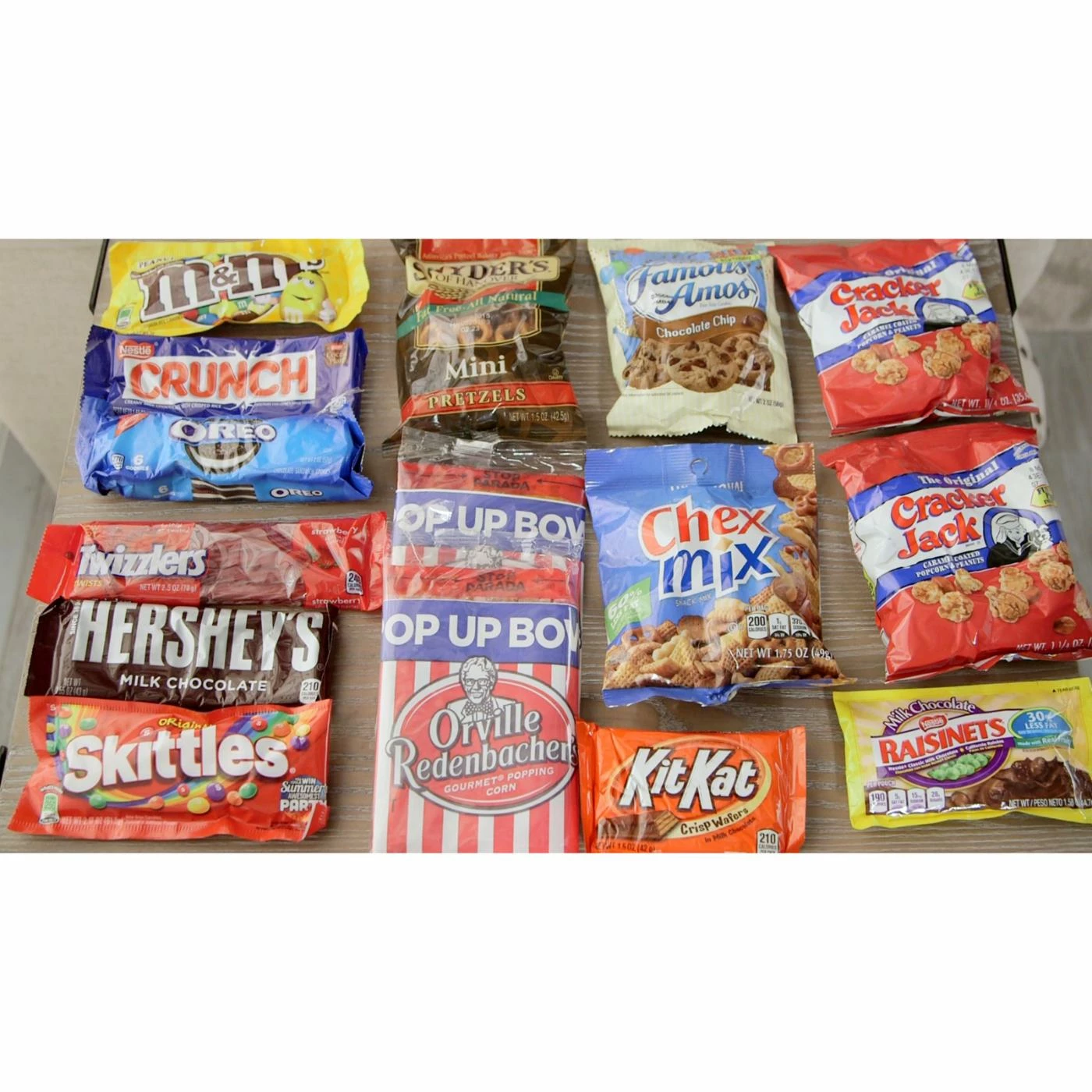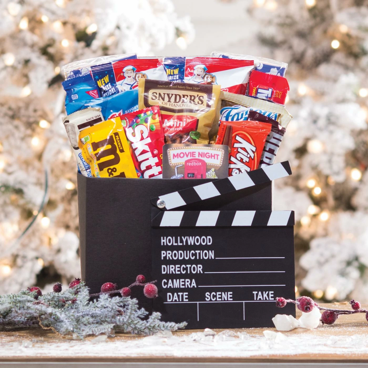2 Microwave pop-up popcorn bowls, Skittles candies, 2 Cracker Jacks bags, Chex Mix snack, Twizzlers licorice, Kit-Kat bar, Chocolate bar, Raisinettes, Peanut M&M’s, Plain M&M’s, Famous Amos chocolate chip cookies, Snyder’s pretzels, Oreo cookies, Red Box gift card good for 6 movie rentals, Movie directorβs chalkboard