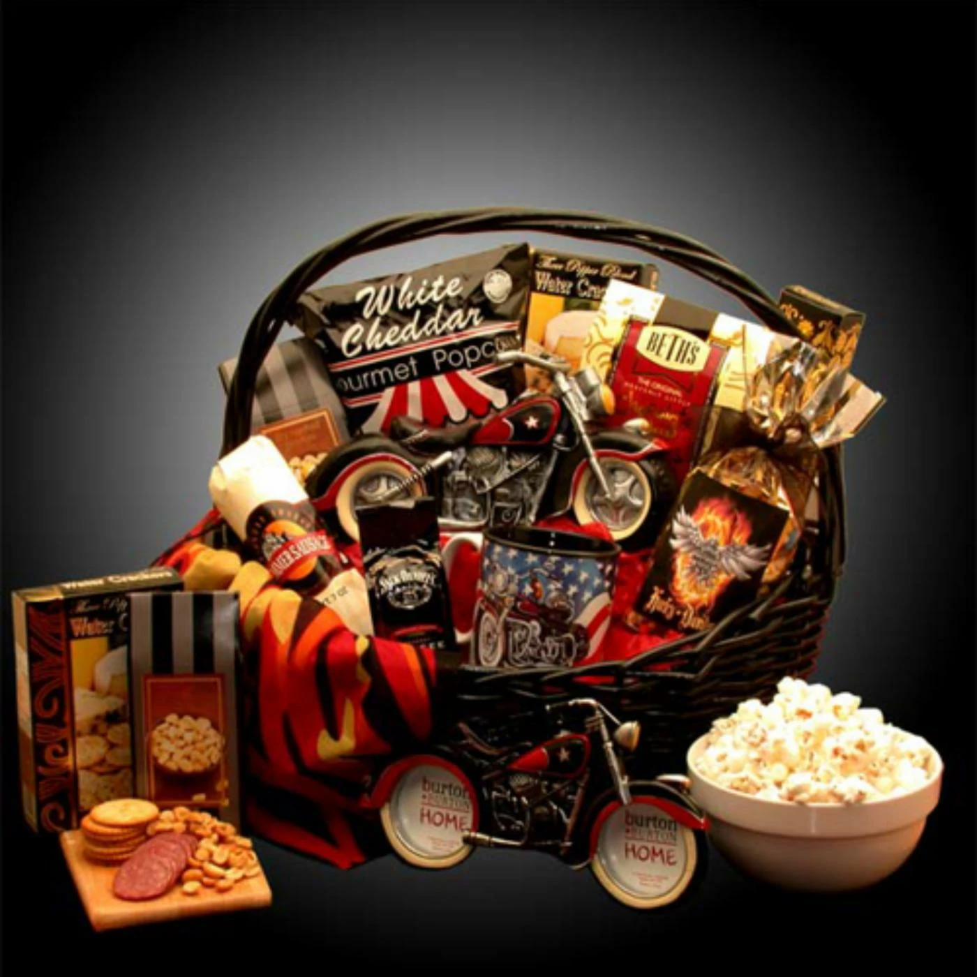 Fans of hogs (and hogging snacks) will love the Heβs a Motorcycle Man Gift Basket. This natural willow basket comes with motorcycle-themed mementos, including a ceramic bank, picture frame, coffee mug, and Flame Riders bandana, and enough snacks for a long journey on the open road. From Harley Davidson three-cheese snack mix to three-pepper water crackers, white cheddar popcorn, summer sausage, and chocolate cream wafer cookies, thereβs something for every craving under the setting sun.