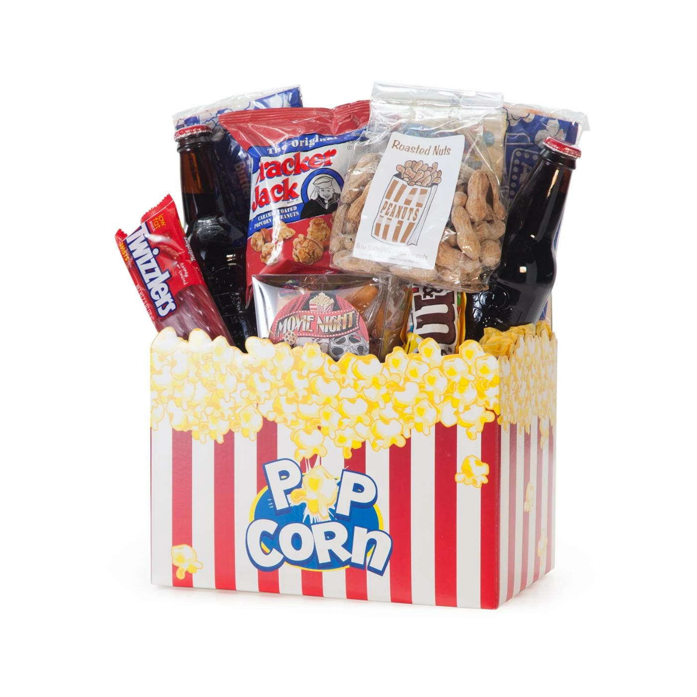 Popcorn gift box, (2) Movie Theatre microwave popcorns, Movie trivia fortune cookies, Cracker Jacks caramel corn, Frito Lay in-the-shell peanuts, Chips A Hoy cookies, Twizzlers, Peanut M&M’s, (2) Classic Root Beers, $10.00 Redbox credit