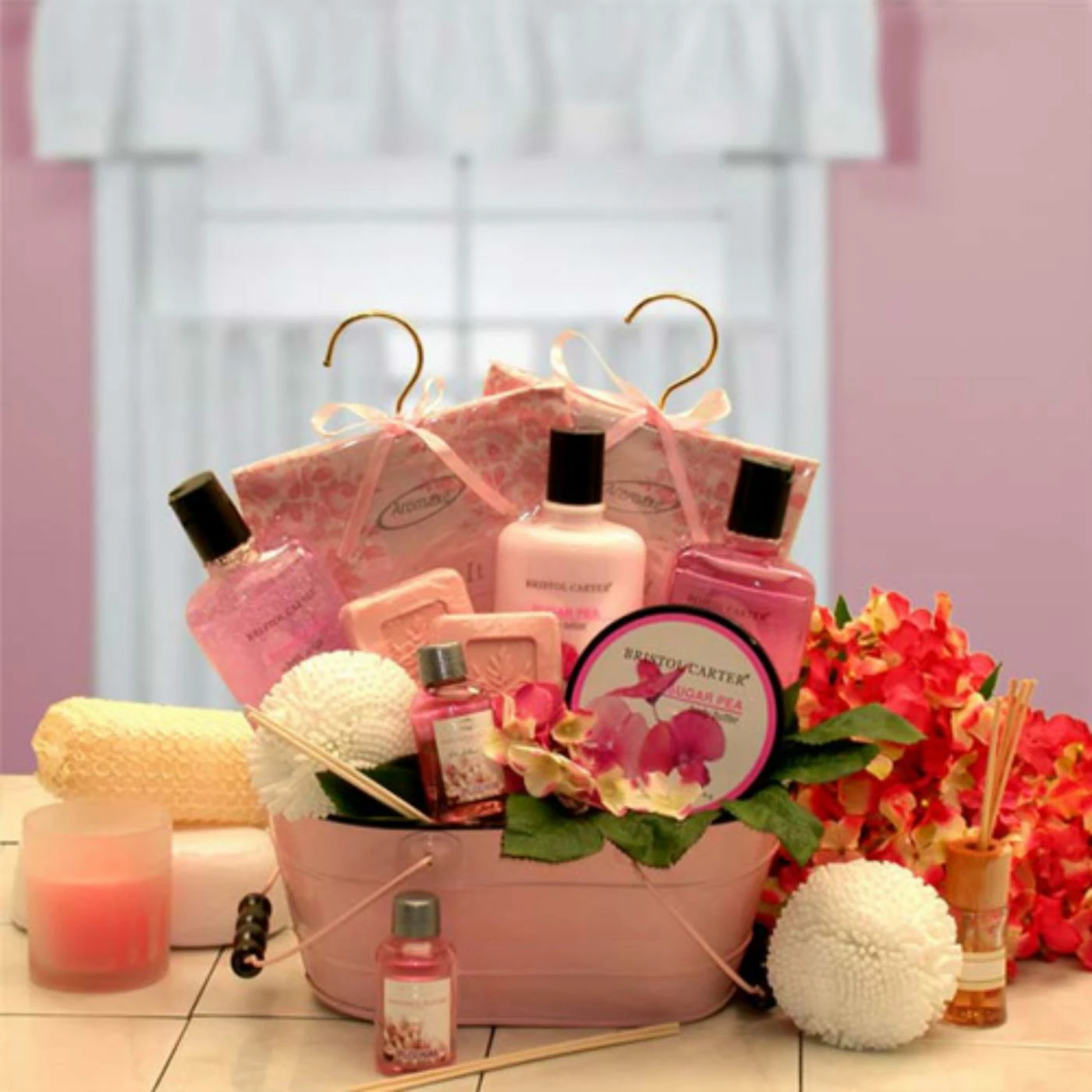 8 0z. Sweet Bloom moisturizing body lotion, 8 oz. Sweet Bloom moisturizing bath and body gel, 8 oz. Sweet Bloom Vanilla hand cream, 8 oz. Sweet Bloom Vanilla body spray, (2) Bars scented soap, (2) Aromatherapy closet sachets, Bath loofah, Floral room diffuser with reeds, 8-inch Oval tub with handles