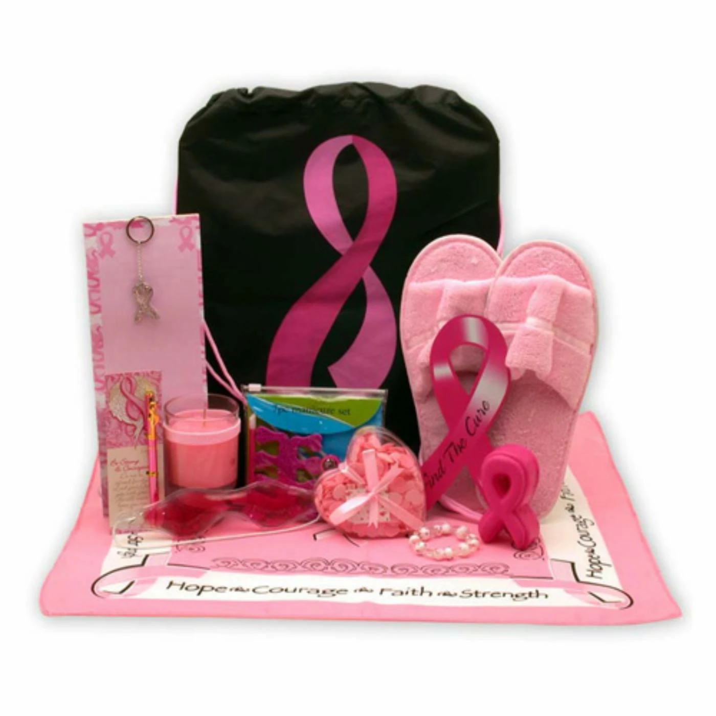 Pink ribbon canvas tote, Rhinestone pink ribbon keychain, Beaded bracelet. Hope & courage bracelet, Pink bandana, Aromatherapy candle, Courage bookmark, Pink pen, Car magnet, Stress-relief ribbon, Notepad, Foaming bath fizzies, Terry cloth slippers, Gel eye mask, 5-piece pedicure set, Gift tote