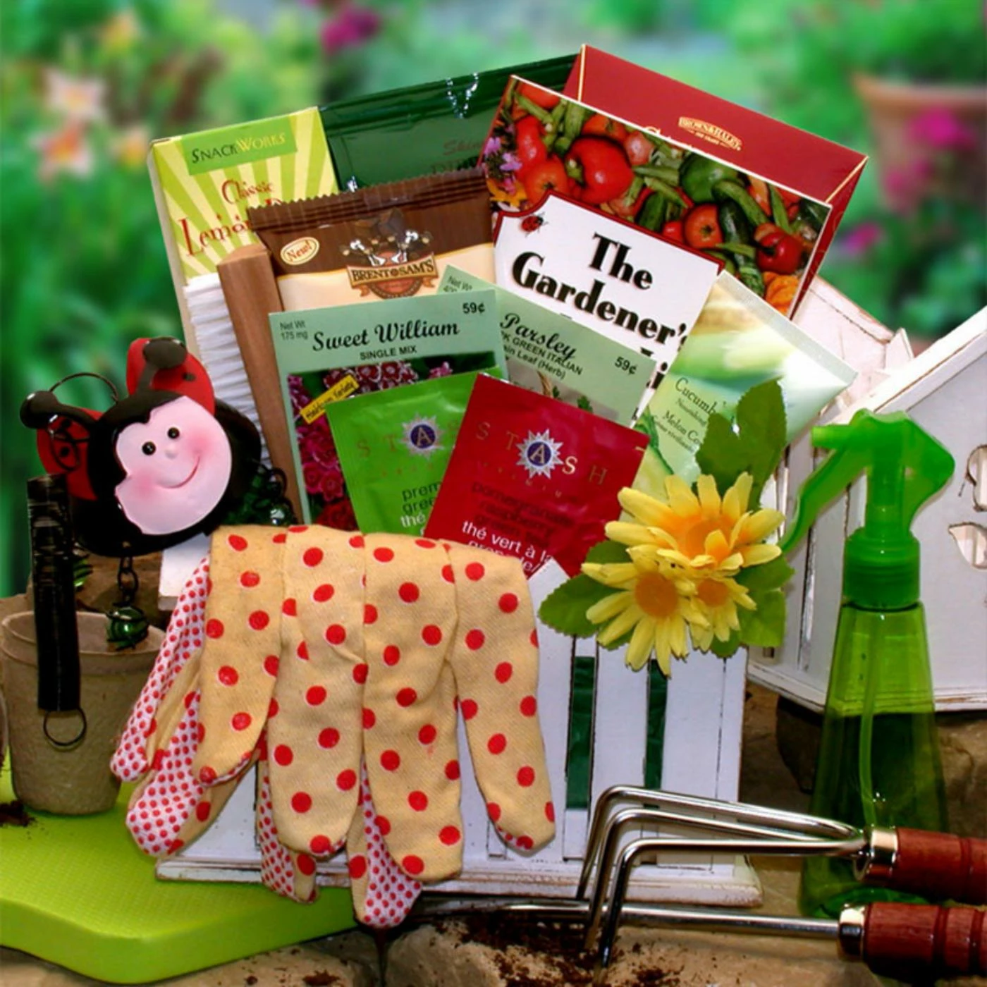 Gift Basket Includes: Garden wind chime, Classic lemon drops, Pretzel sticks, Cashew Roca toffee chocolates, Brent & Sam’s chewy chocolate chip cookie, Bristle nail brush, Foam free pad, Garden spade, Garden trowel, Gardening gloves, (2) Assorted herbal teas, Spritzer water bottle, (2) Seed packets, Hand cream