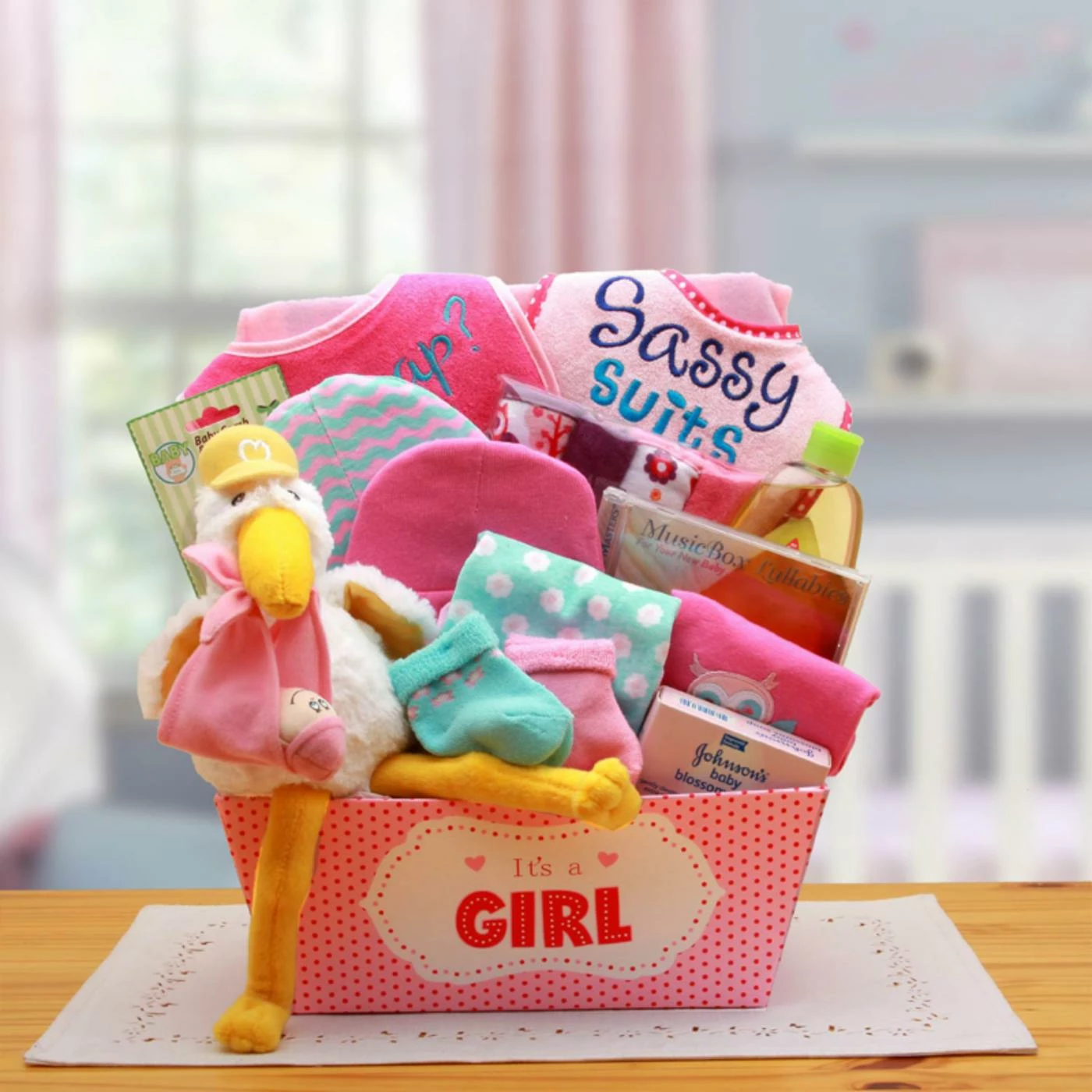 Gift Basket Includes: Plush stork, Baby lullaby CD, Baby brush and comb set, Johnson & Johnson baby shampoo, Johnson & Johnson baby soap, Receiving blanket, 4 baby washcloths, Two 100% cotton baby beanies, Two 100% cotton baby bodysuits, Two 100% cotton baby bootie sets, 2 bibs
