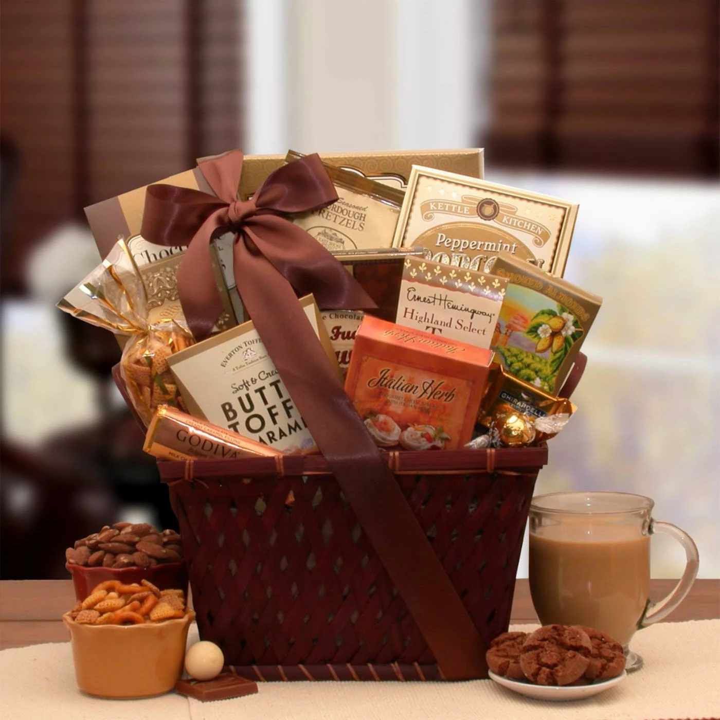 Sure to impress, the Gift Basket Drop Shipping Classic Favorites Gift Basket is rich with favorite treats to make anyone smile. This gourmet gift basket is ideal for any occasion and comes packaged with your personal message card. Its wood chip basket is filled to overflowing, wrapped in cellophane, and includes a hand-tied bow.