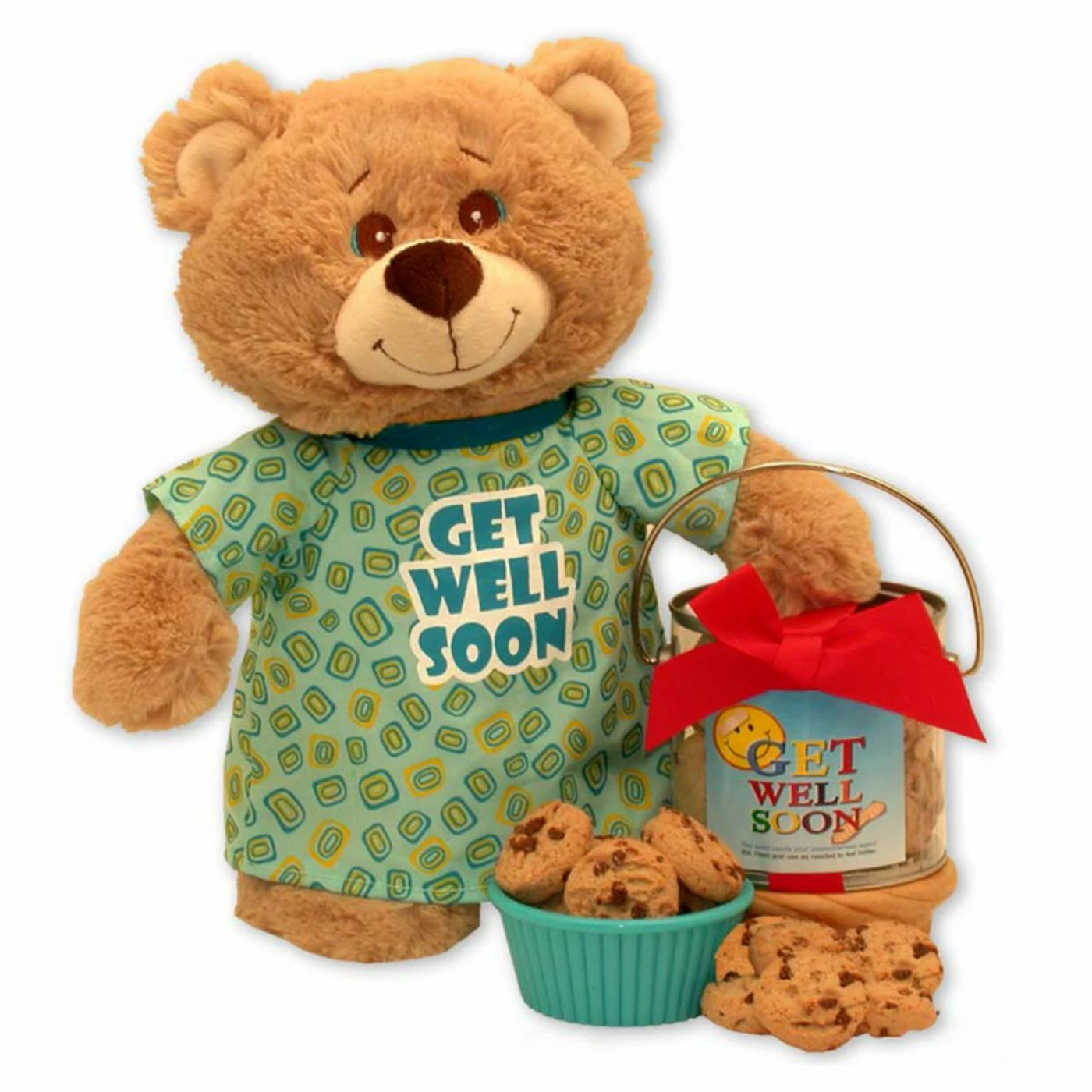 Send a snack, a snuggle, and a smile to a friend in need with the Gift Basket Drop Shipping Get Well Soon Teddy Bear and Cookie Pail. This sweet gift includes an adorable plush teddy bear dressed in a hospital gown with a get-well wish, toting a bow-adorned resealable paint can filled with mini chocolate chip cookies. It’s a true testament that smiles (and maybe cookies, too) can make anyone feel better.