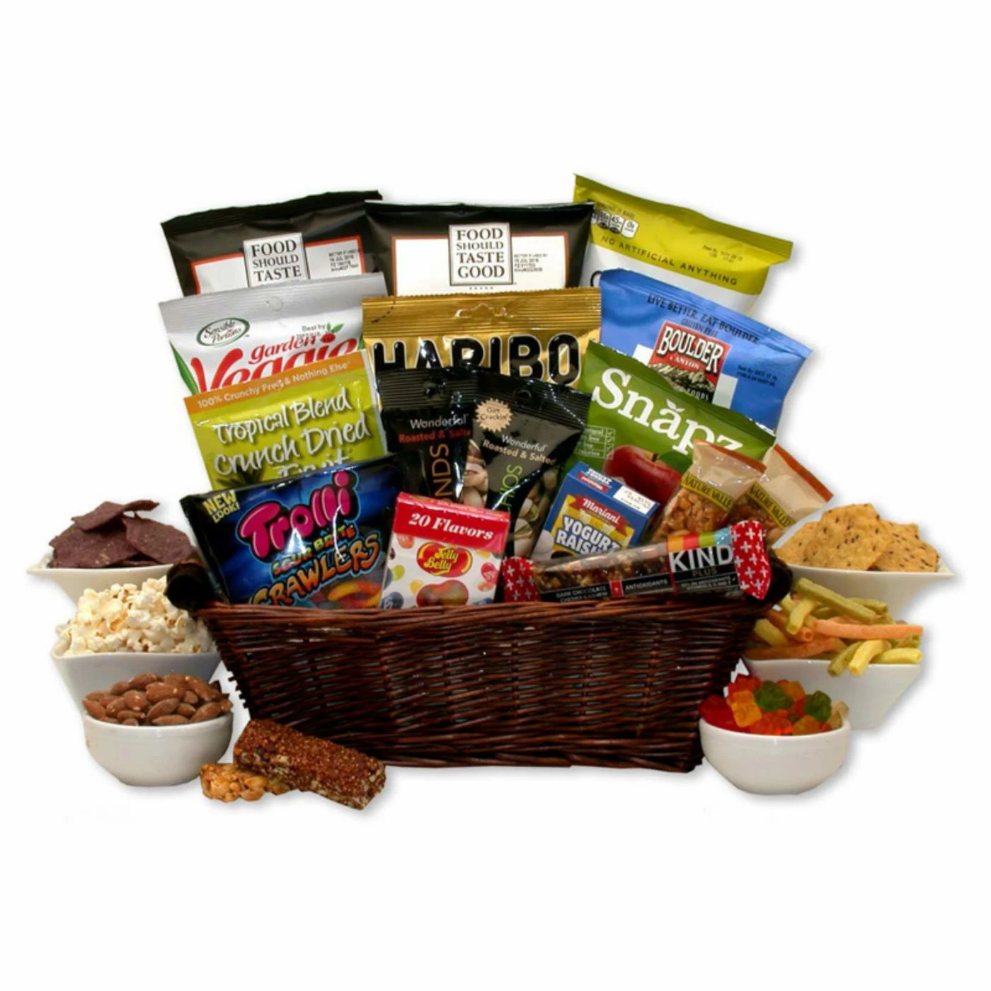 Willow tray, Garden ranch veggie straws, Food Should Taste Good sweet potato chips, Boulder creek kettle chips, Haribo gummy bears, Tropical sweet dried fruit snacks, Trolli night crawlers sour worms, Jelly Belly 20-flavor gift box, Marriani yogurt raisins, Kind chocolate granola bar, Wonderful pistachios, Wonderful almonds, Snapz sweet dried apple crisp snacks, 2 Nature Valley granola bars