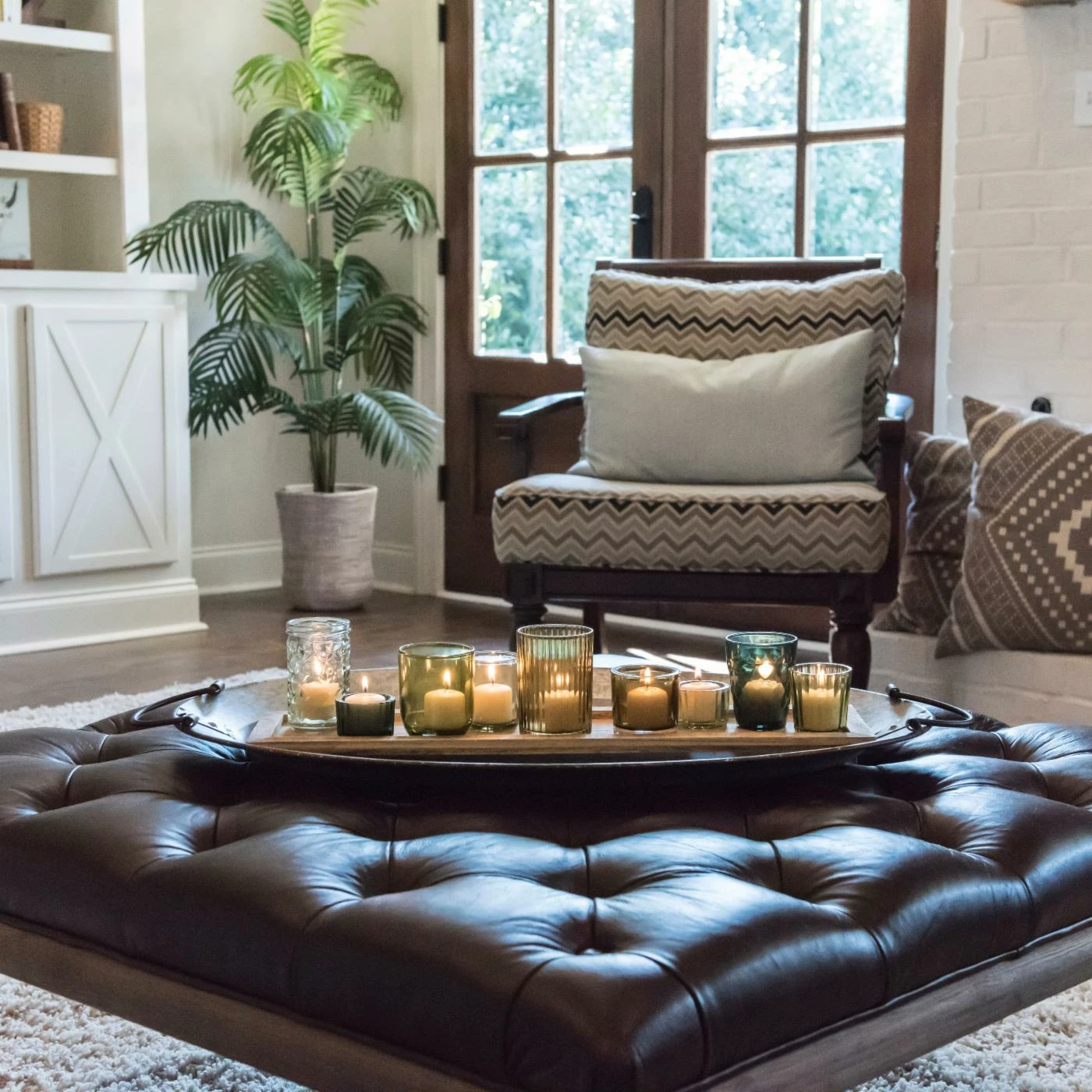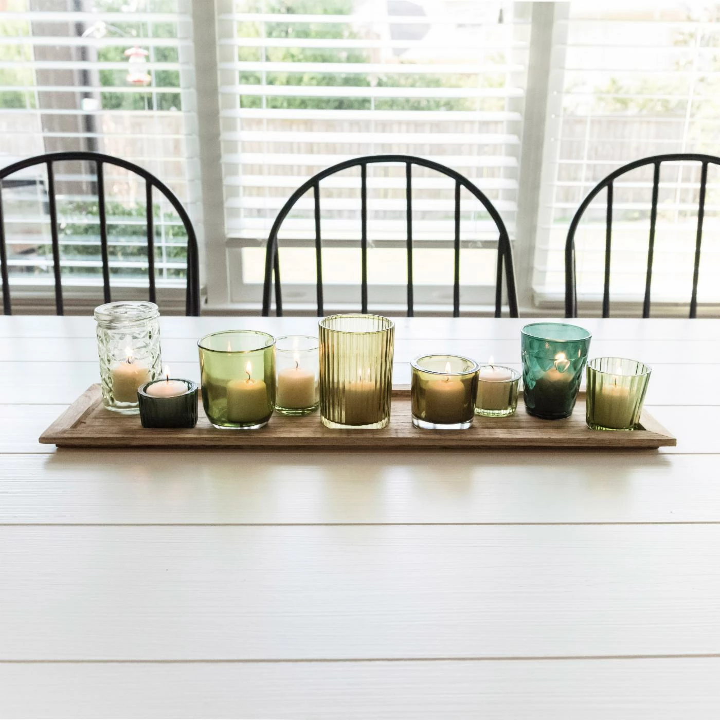 The 3R Studios Wood Tray with 9 Green Glass Votive Holders adds a fun element to your dΓ©cor with a sturdy wooden tray cradling nine glass votive candle holders. This eclectic set boasts a variety of sizes and textures along with varying shades of green to bring your home an earthy illumination.