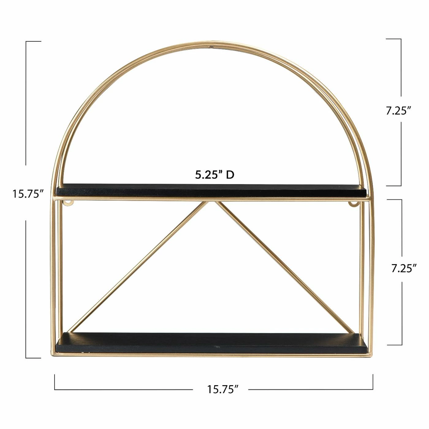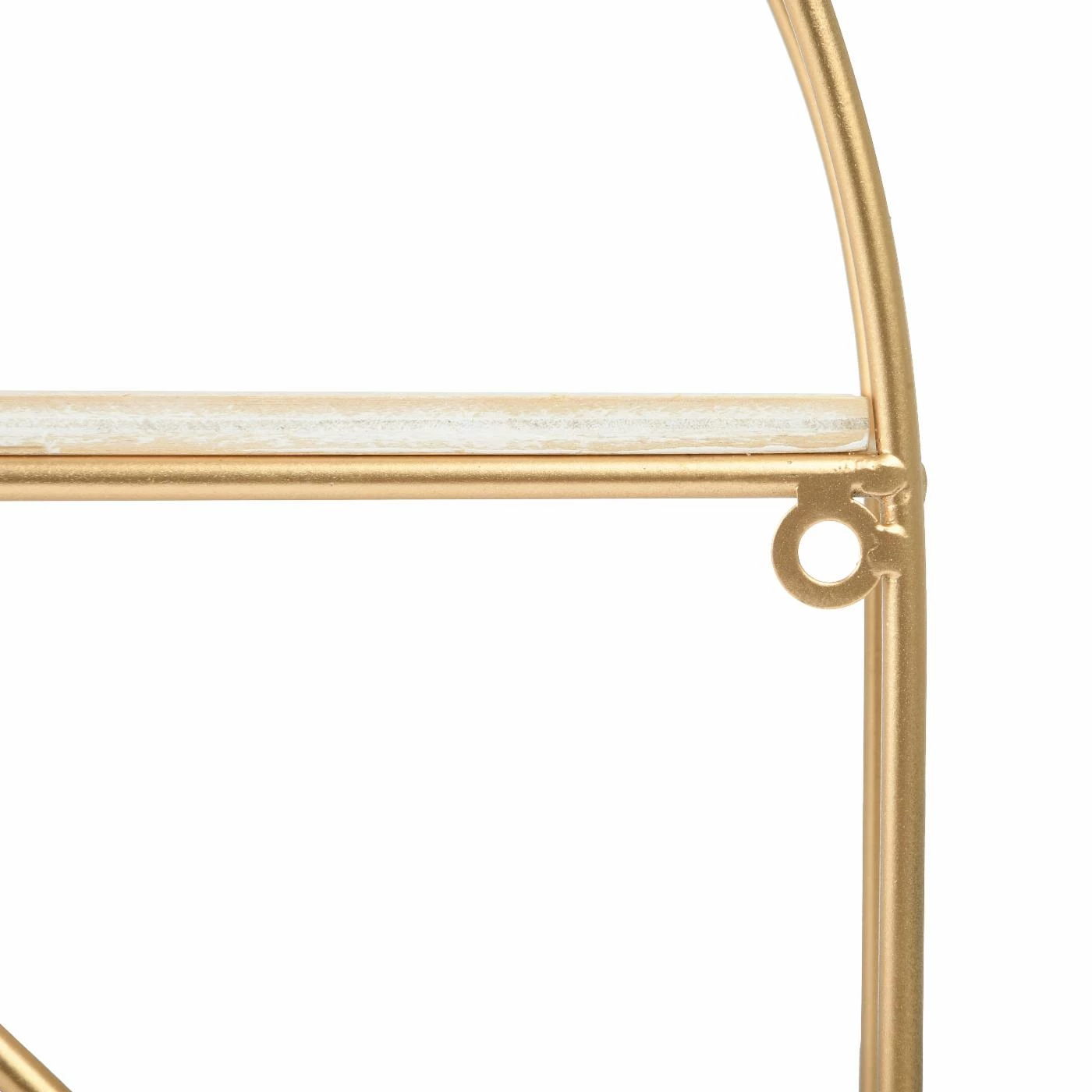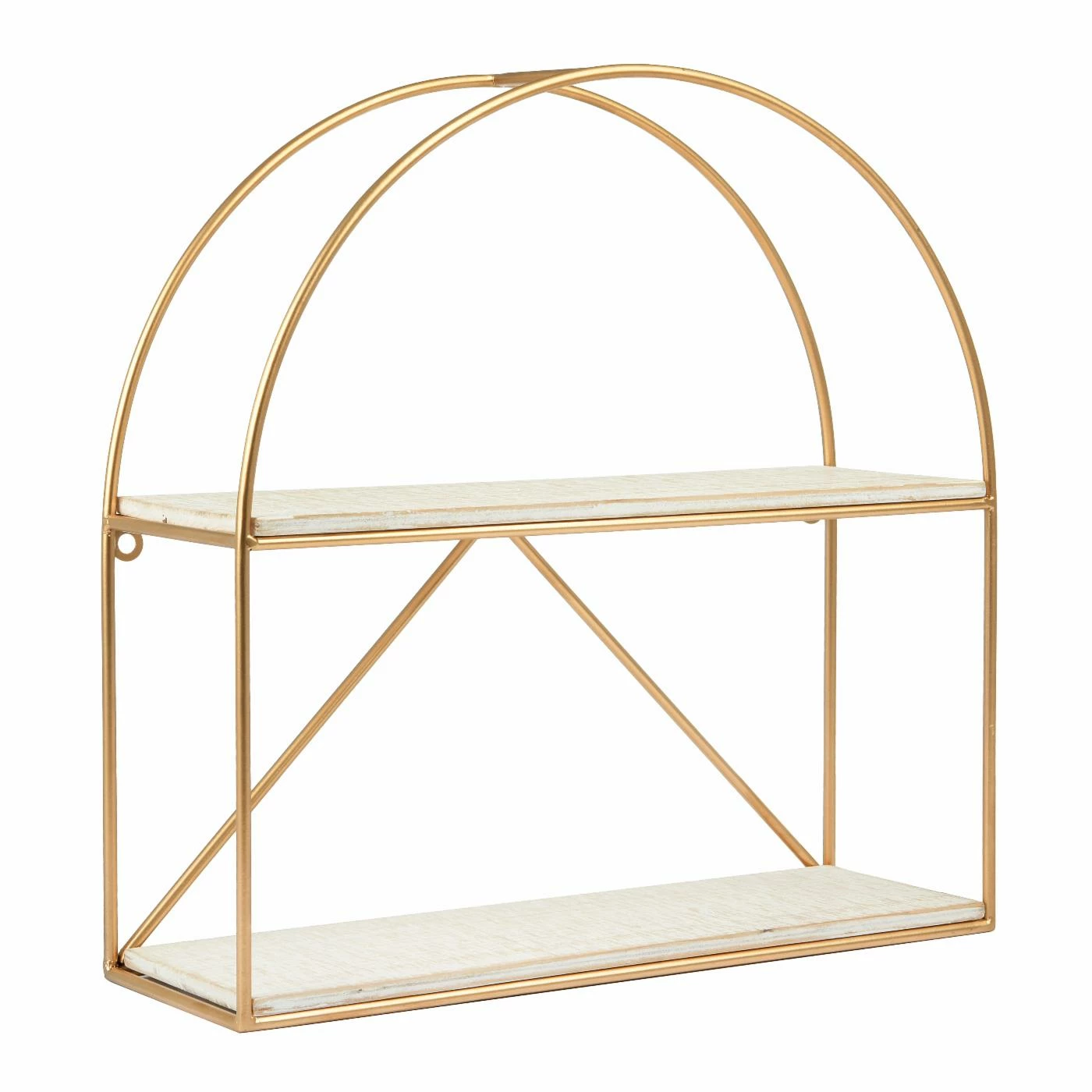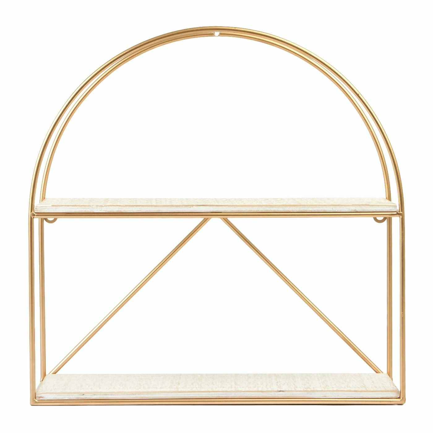 This versatile wall shelf offers storage and display for plants, books, trinkets, and treasures. Featuring a dual crescent shaped iron frame in a gold finish with two wood plank shelves in a white wash finish. Mount to any wall to maximize storage in small spaces. As functional as it is pretty, use in your entryway, kitchen, office, or bathroom to stash essentials or to highlight your favorite things. Includes 2 eyehooks for easy mounting.