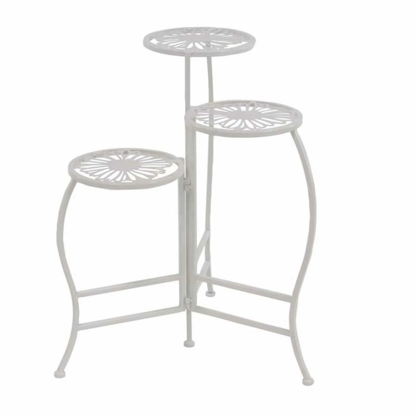 Bring timeless charm to a garden or patio with the DecMode Natural Iron Folding Plant Stand with Floral Design, topped with a whimsical floral cutout design. Made of iron, this durable plant stand includes a folding function for easy storage. Three tiers provide you with ample room to show off your treasured plants in style.