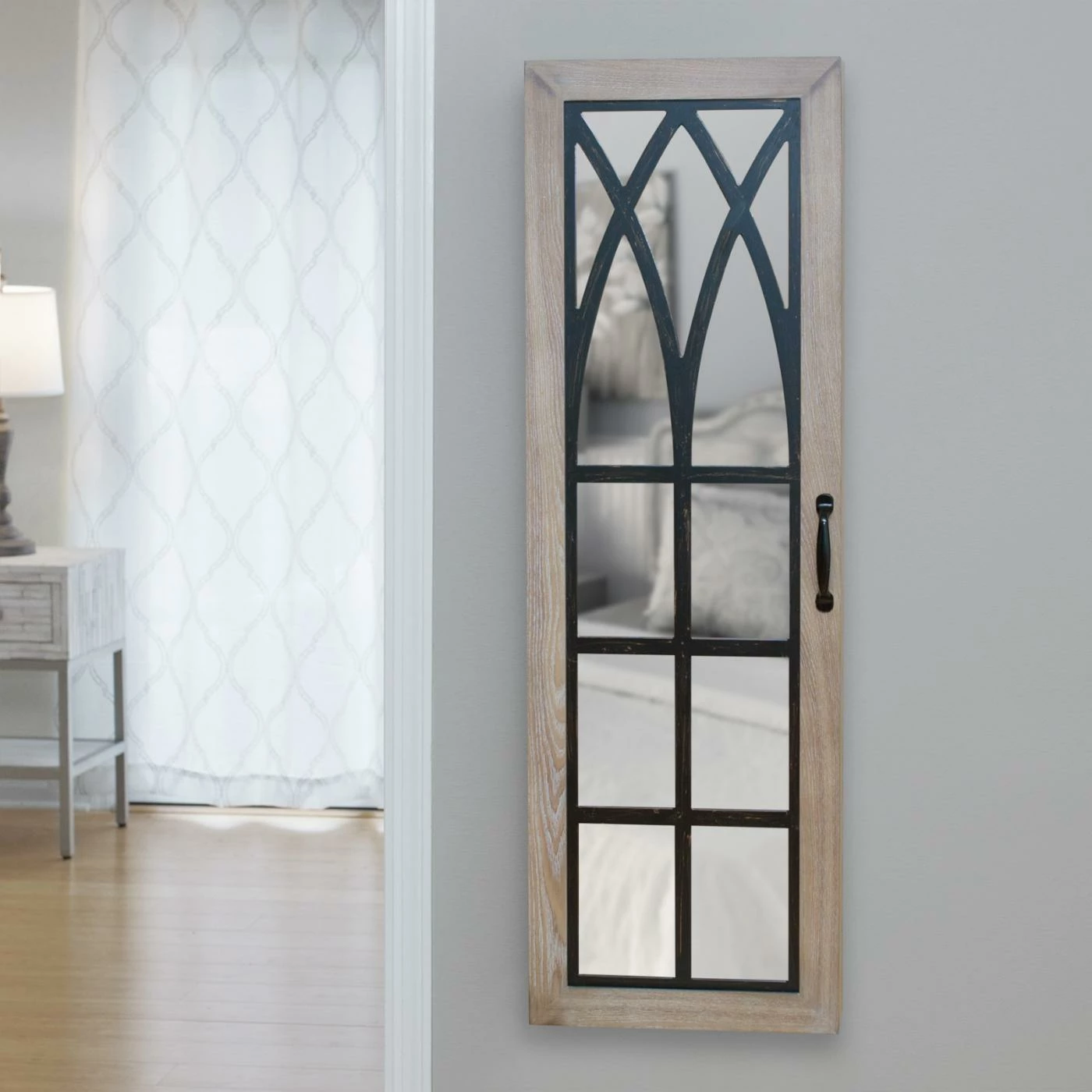 The pile of jewelry on your dresser top or in a drawer is a thing of the past with the FirsTime Rustic Arch Wall Mounted Jewelry Armoire – Rustic Brown. This armoire is a jewelry storage unit disguised as a mirror disguised as an art piece. Enjoy the wooden rustic frame look that creates a window effect with a touch of extra style. Hang the armoire over your closet or bedroom door to use the mirror and keep everything organized and nearby without adding clutter to your space. Open the armoire to view all of your jewelry items neatly stored and displayed, right next to an interior mirror for easy use.