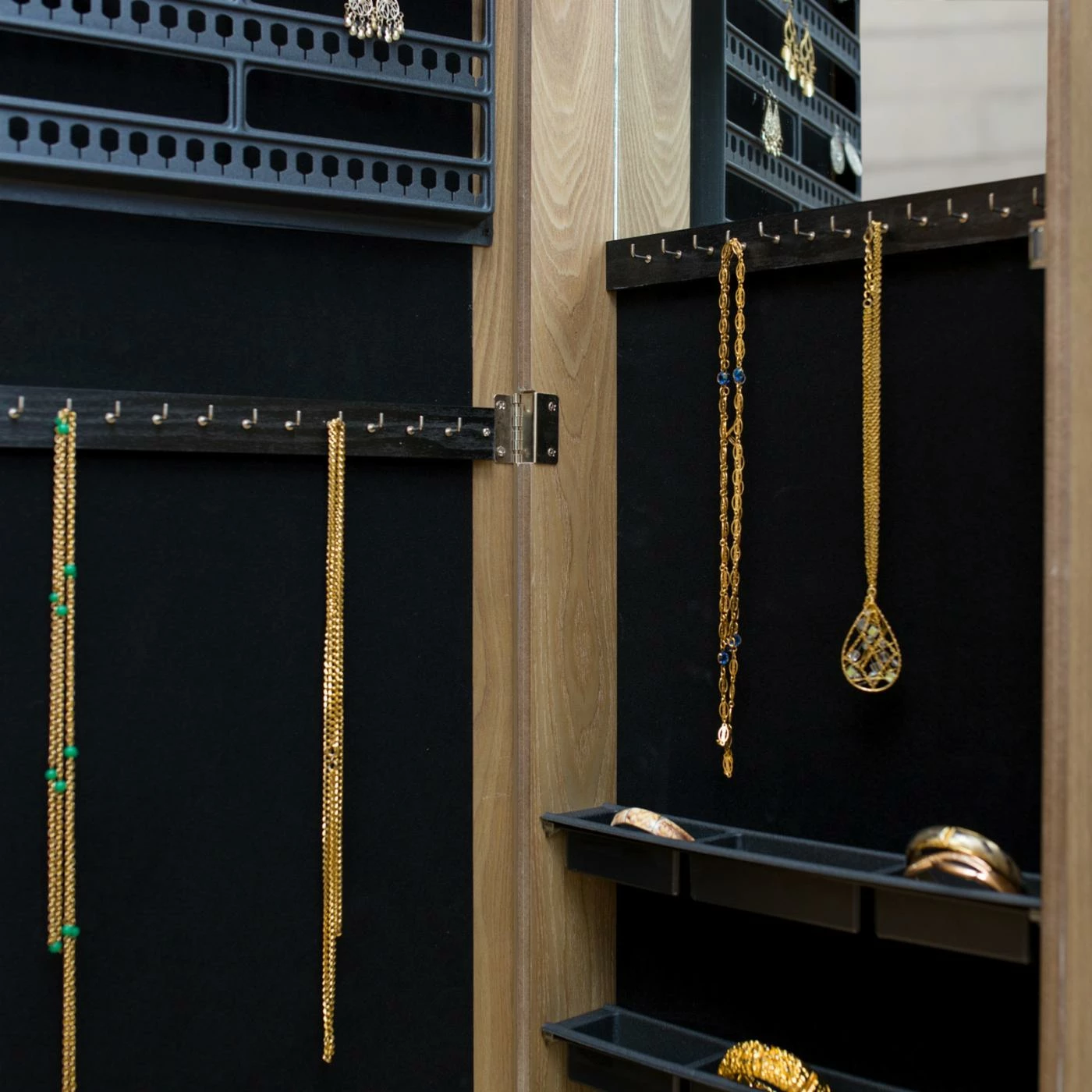- Holds 84 rings, 50 pairs of earrings, and contains 24 hooks for necklaces and bracelets