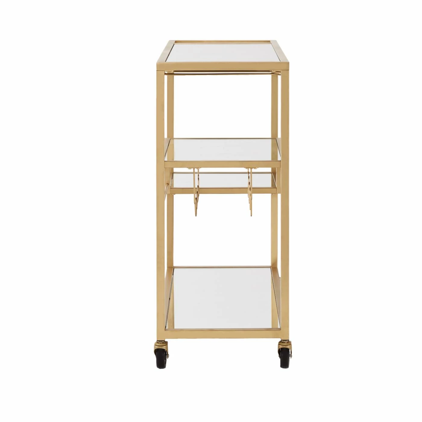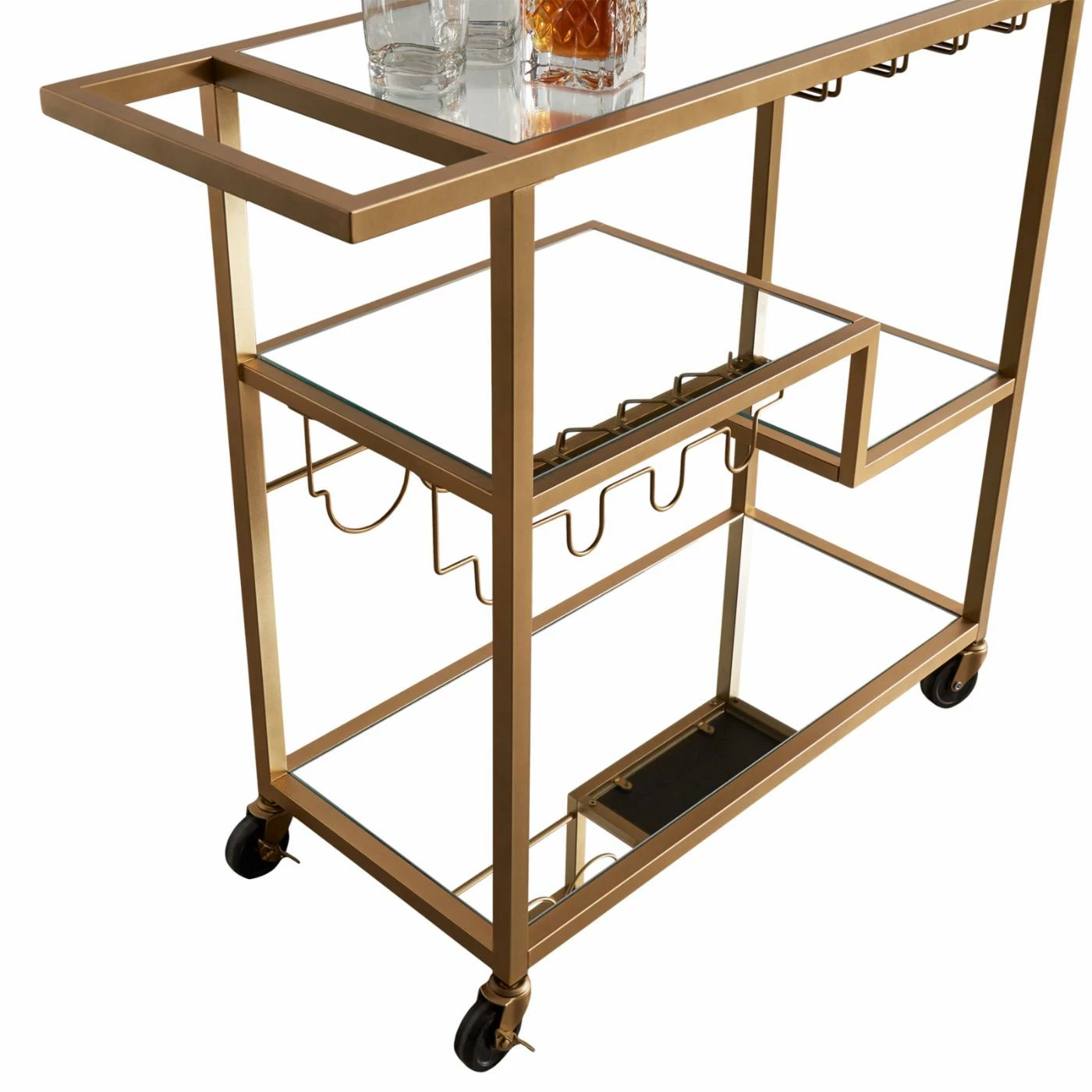 Serve drinks in the style of Daisy and Gatsby with the Art Deco-inspired HN Home Loewy Mid-Century Modern Mirror Glass Metal Bar Cart. The three tempered glass shelves provide plenty of space for bottles and tools, and the spacious glass top lets you mix and serve cocktails with ease. Four stemware rails and a four-bottle storage rack make this durable metal bar cart a wine lover’s dream. Caster wheels allow the cart to roll smoothly to wherever you’re entertaining. You can lock the wheels for security when you reach your destination. Some assembly required.