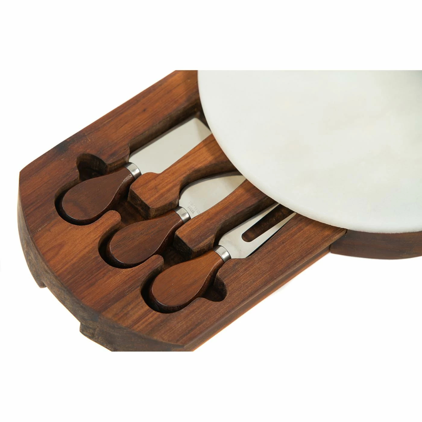 The Picnic Plus Winslow Marble Cheese Board is more than meets the eye. This acacia wood cheese board features a marble accent piece in your choice of available color. Hidden within the board is a pull-out tray that includes three stainless steel serving tools. Use the board to offer guests everything from cheeses to appetizers to desserts.