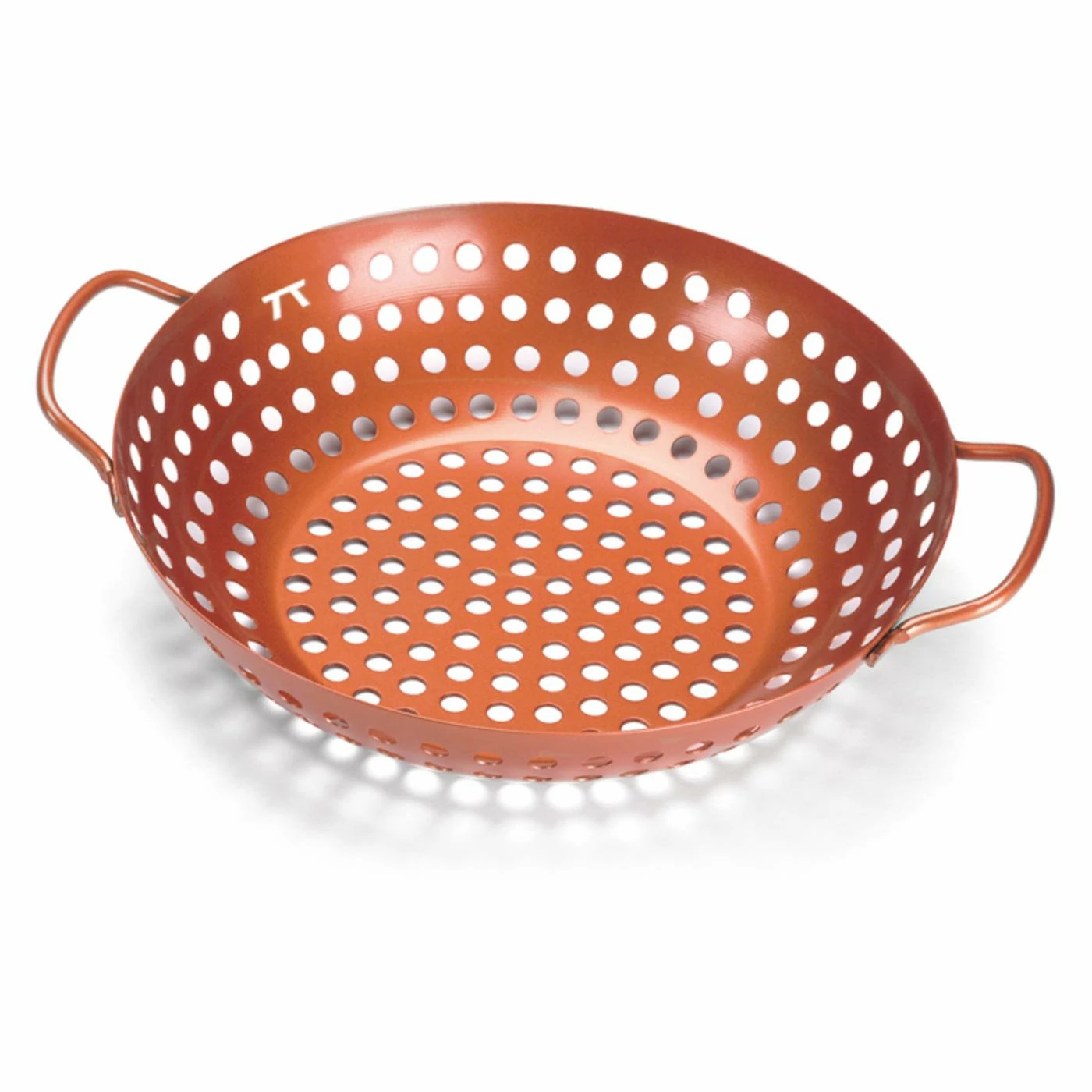 Work that grill magic with the Outset Round Copper Non-Stick Grill Wok. This gleaming copper-finish wok cooks veggies and other tasty morsels on the grill by letting heat from the flames rise into the bowl. Crafted from durable iron, this wok withstands intense and features convenient handles for safe handling.