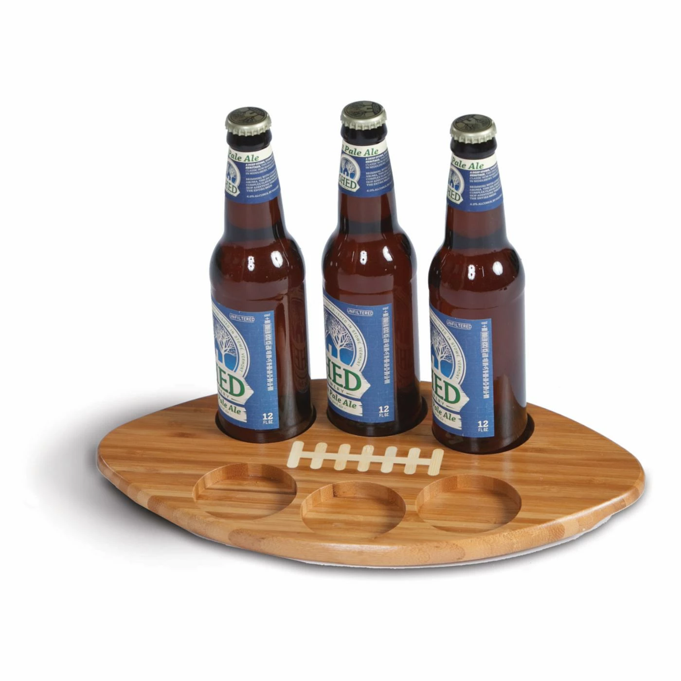 Get ready for game day with the Picnic Plus Beer Huddle Tray. Crafted from eco-friendly bamboo and polished to add a refined touch to its football-shaped design, this beer tray is ideal for tailgates and entertaining. The six recessed holes are ideal for beer bottles or tasting glasses for versatile appeal.