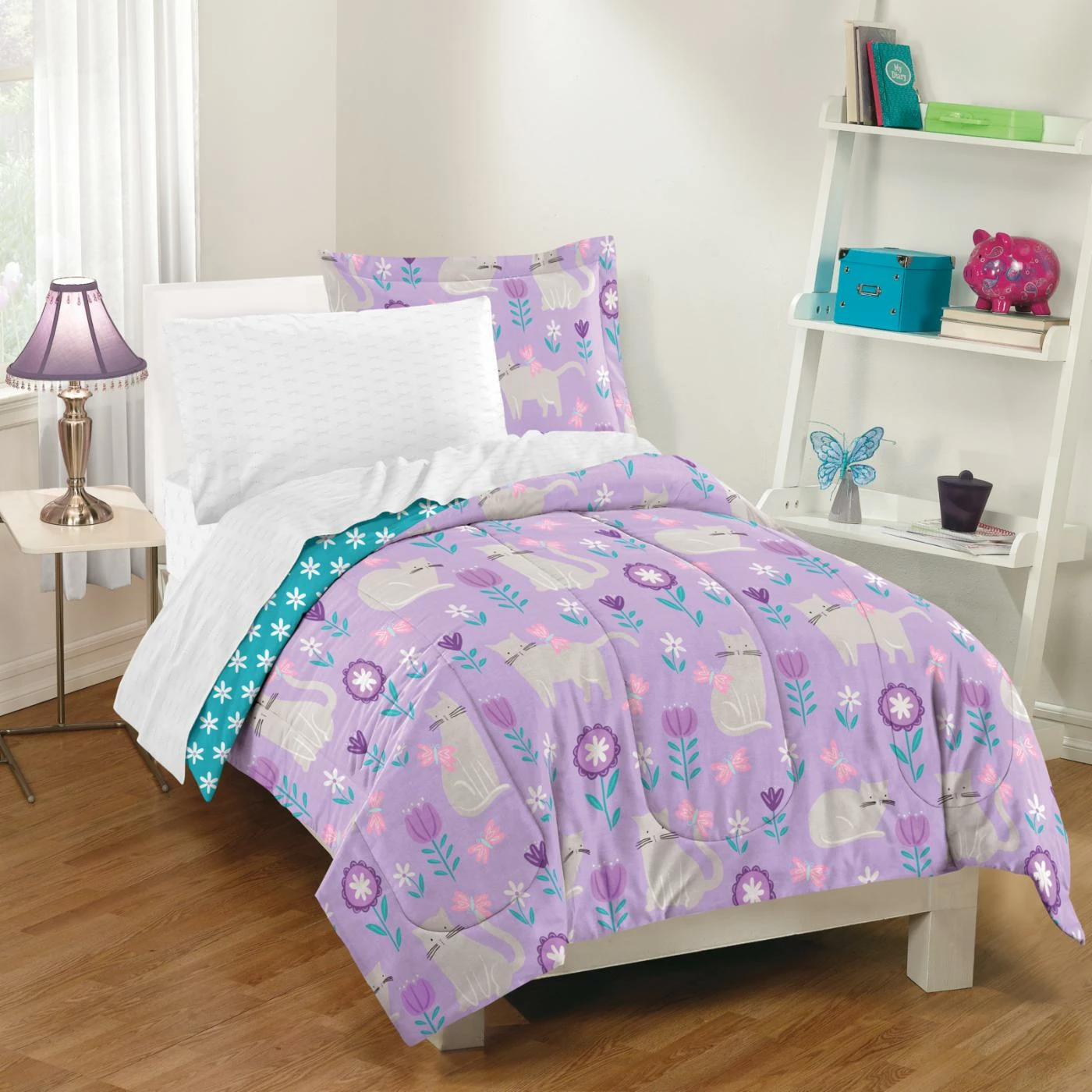 Your little one is sure to love the Cat Garden 5 Piece Bed in a Bag Set by Dream Factory. This bedding set’s comforter and pillow sham are adorned with a charming cartoon cat design with flowers and butterflies over a purple background. The comforter and sham are also reversible, featuring a turquoise white daisy pattern on the back. The sheets and pillowcases feature a subtle cat whisker pattern which completes the adorable feline theme of this set. Perfect for the young cat lover, this whimsical bedding set is sure to add a cheerful note to your child’s bedroom, and the set is offered in a choice of available sizes. Made from ultra-soft 100% microfiber polyester fabric, this bedding set is also fully machine washable, making it easy to care for.