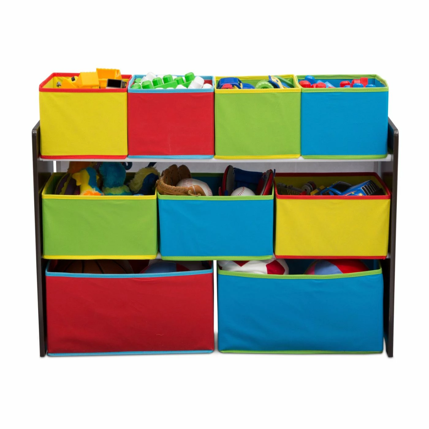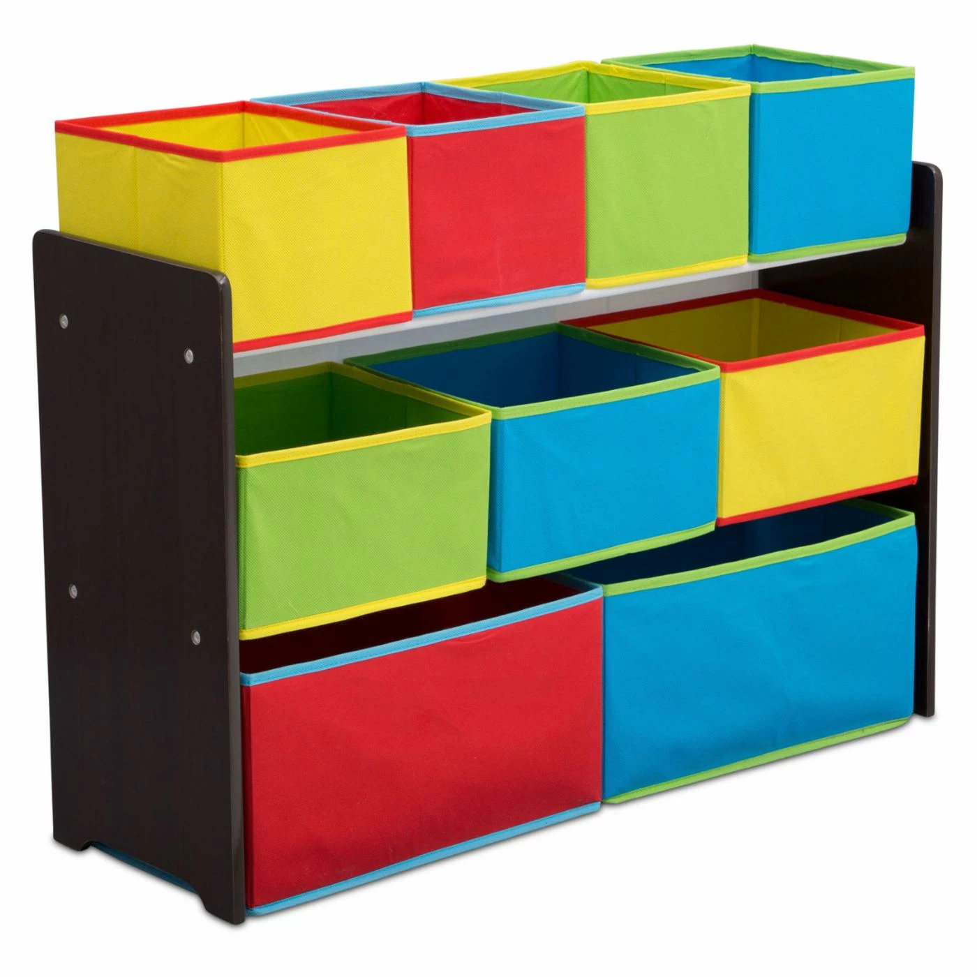 The Delta Children Deluxe Multi-Bin Dark Chocolate Toy Organizer with Storage Bins is a must-have for any playroom. It rests on a durable engineered wood frame with nine fabric storage bins in a rainbow of colors. It makes cleaning up easy, as these bins are easy to access and place toys into. This toy organizer is also the ideal height for your kiddos.