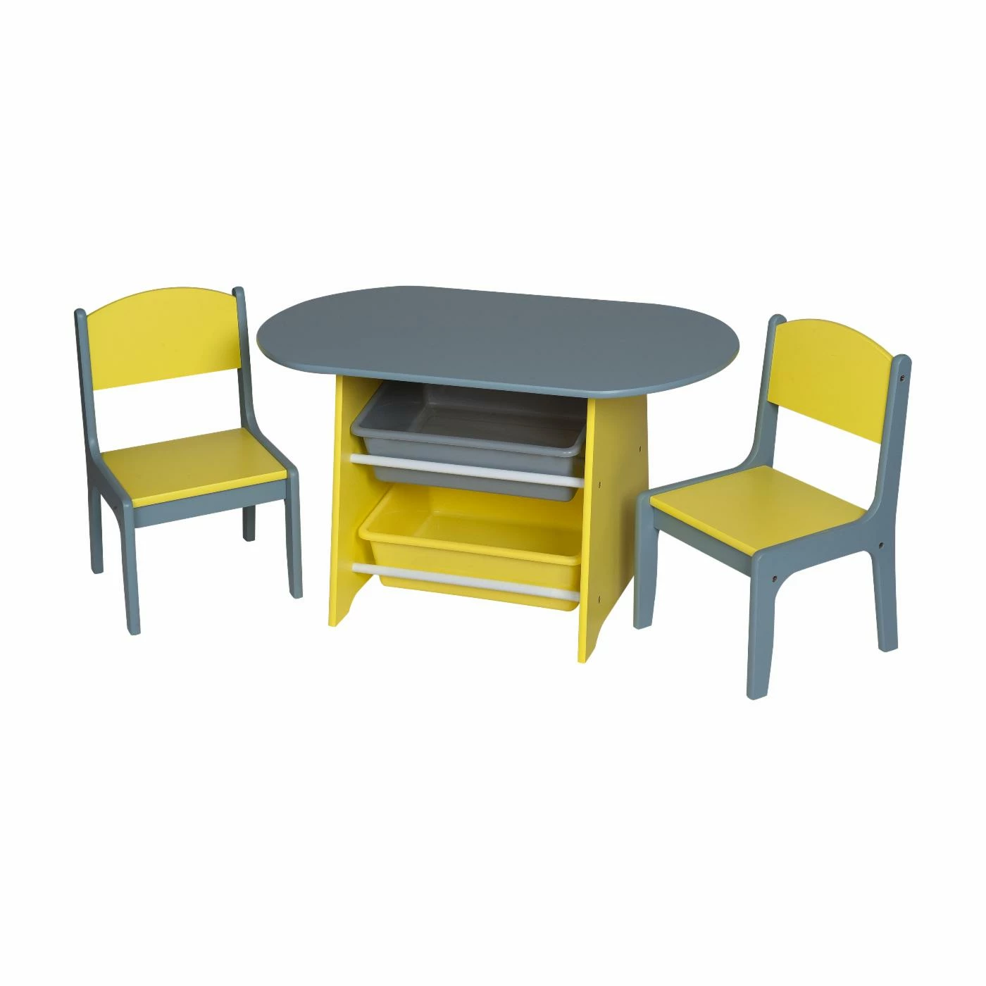 Starting a new puzzle or working on a coloring books is easy at the Gift Mark Oval Childrens Table and Chair Set with Undertable Storage Bins – Gray/Yellow – just reach into one of the storage bins in the base for any necessary supplies. This set includes two kid-sized chairs and an oval table complete with plastic storage bins. The chairs and table are made of sturdy engineered wood with a bright yellow and gray finish that is sure to draw any kid’s attention. This set is made for children three years and up.