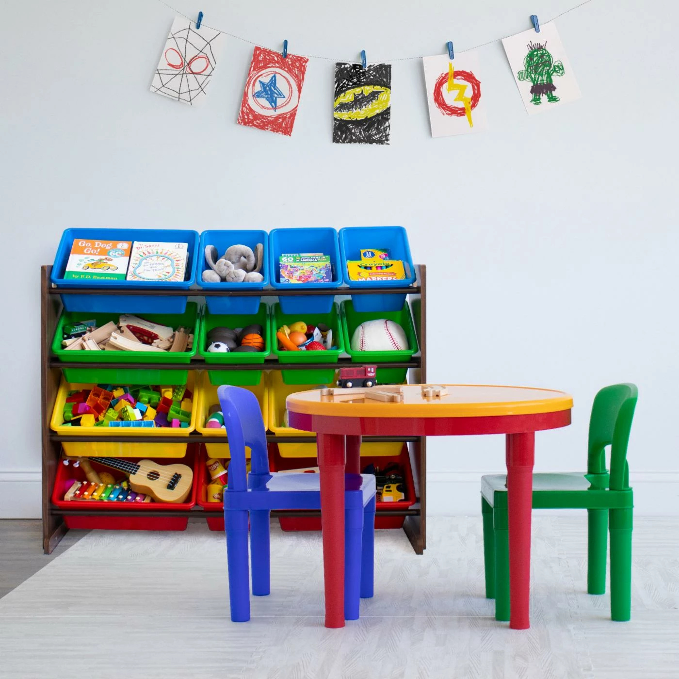 Great for master builders who are three to six years old, this Humble Crew 2-in-1 3 Piece Activity Table and Chairs Set features a round activity table compatible with most building blocks. The table includes a center space for storing blocks plus a removable cover and two chairs to match. The set is made of sturdy, easy-clean plastic and is available in a variety of colors.
