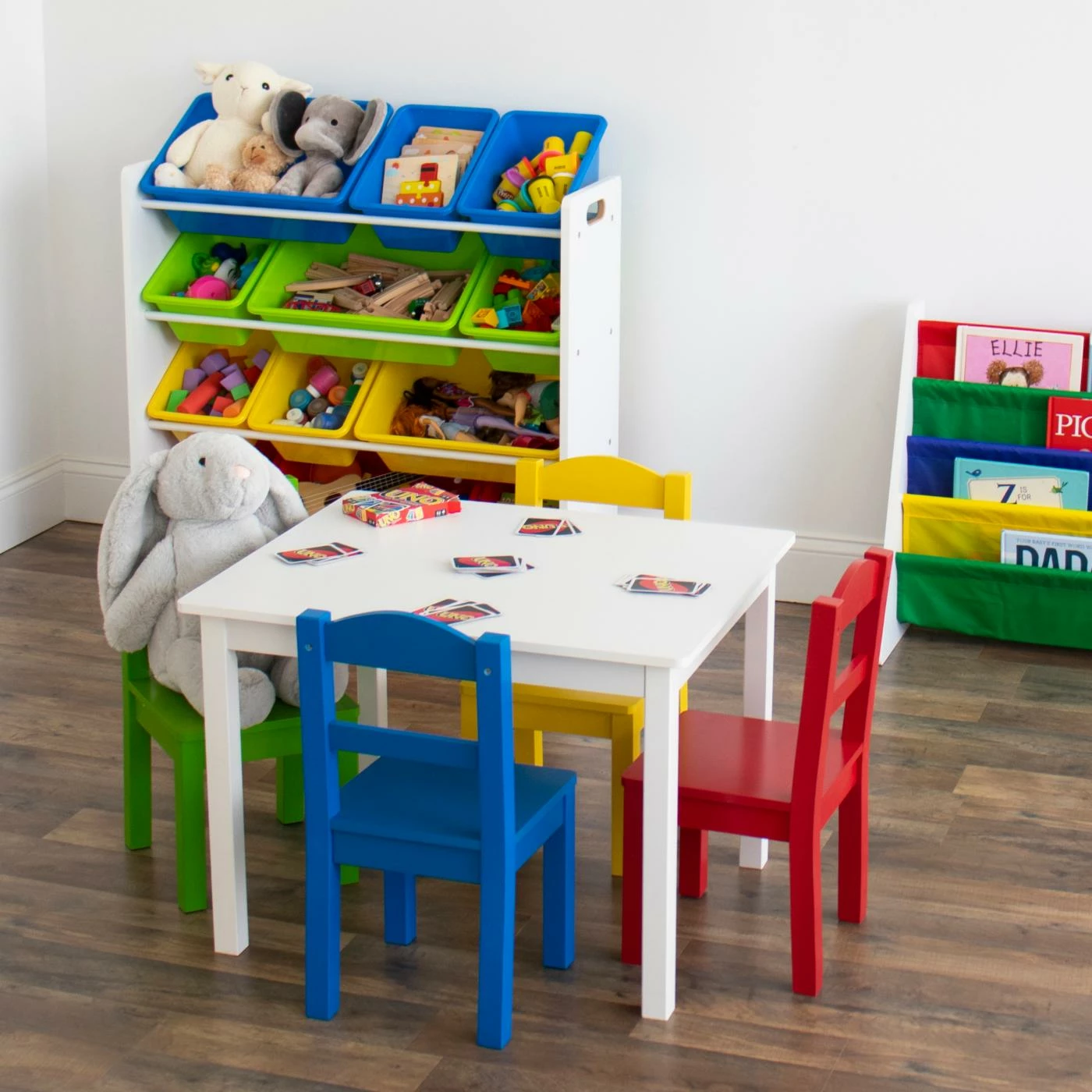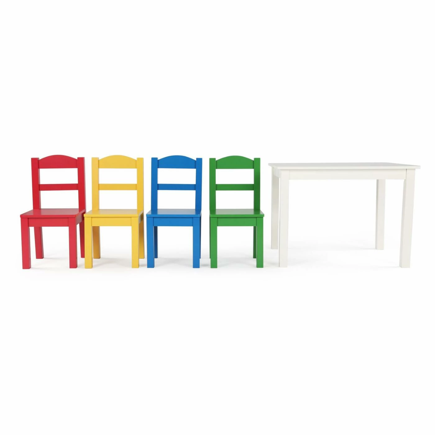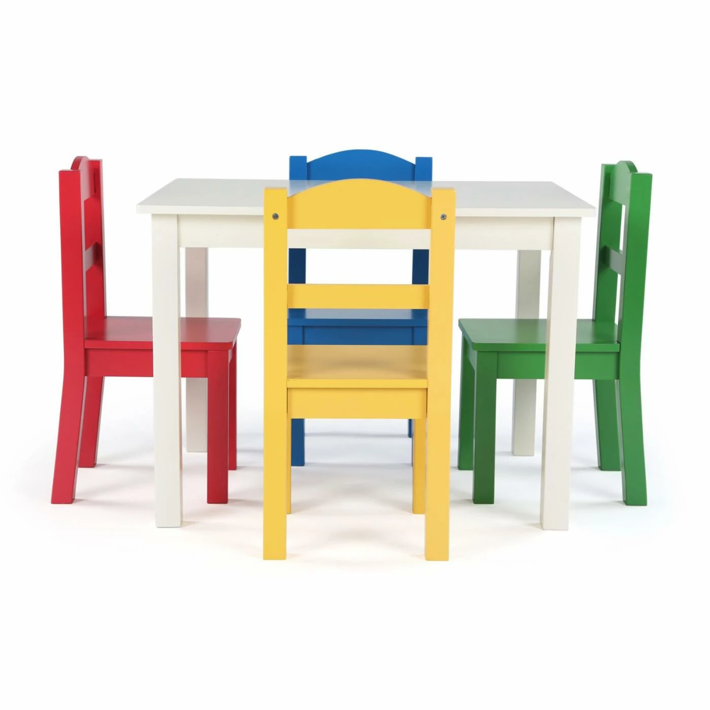 Make a fun space just for the kids with the Tot Tutors Summit Kids Table and Chairs Set. This little table and chair set features a white, rectangular table and four chairs, one each in green, yellow, blue, and red. Angled legs help keep kids on the ground, instead of tipping back.