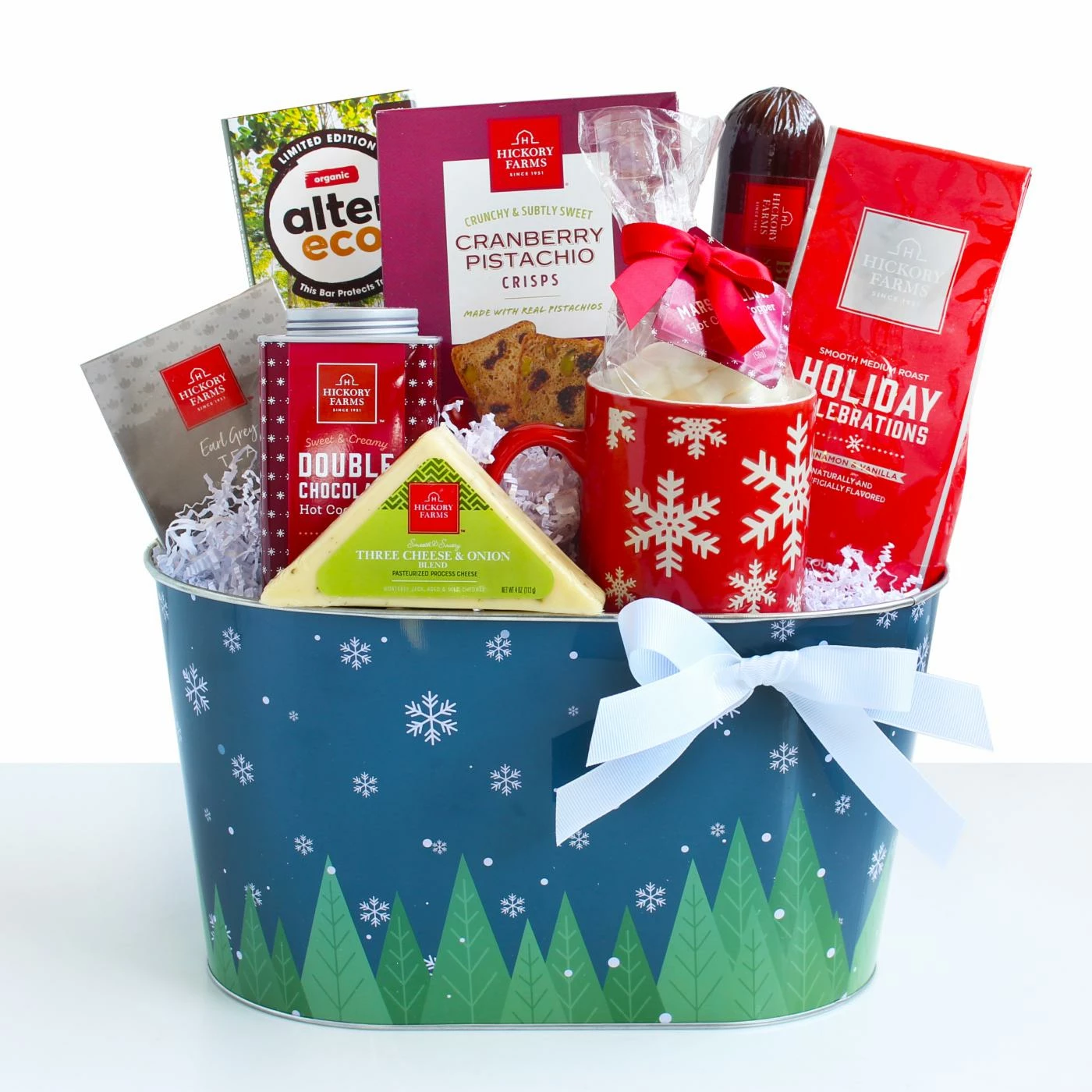 Indulge in this perfect blend of meat and cheese products along with all of the necessities to enjoy a warm winter beverage. This wonderful gift includes coffee, hot cocoa and tea in the festive snowflake mug. Perfect for those cold winter days and nights.