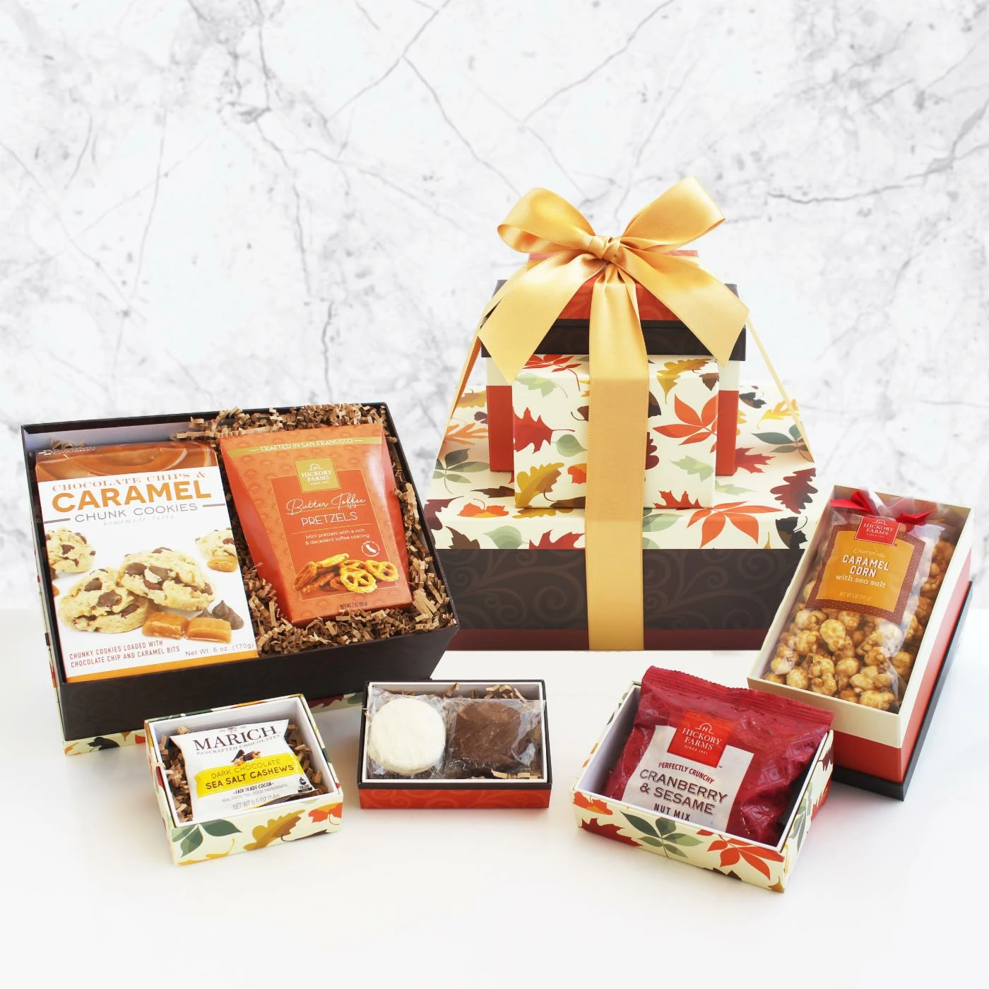 Celebrate the fall season with a stack of treats. They’ll love to unwrap this collection of sweets like toffee pretzels, popcorn, Milk Chocolate Covered Sandwich Cookies. With signature decorated boxes and a ribbon, this gift tower is a great way to show someone how thankful you are!
