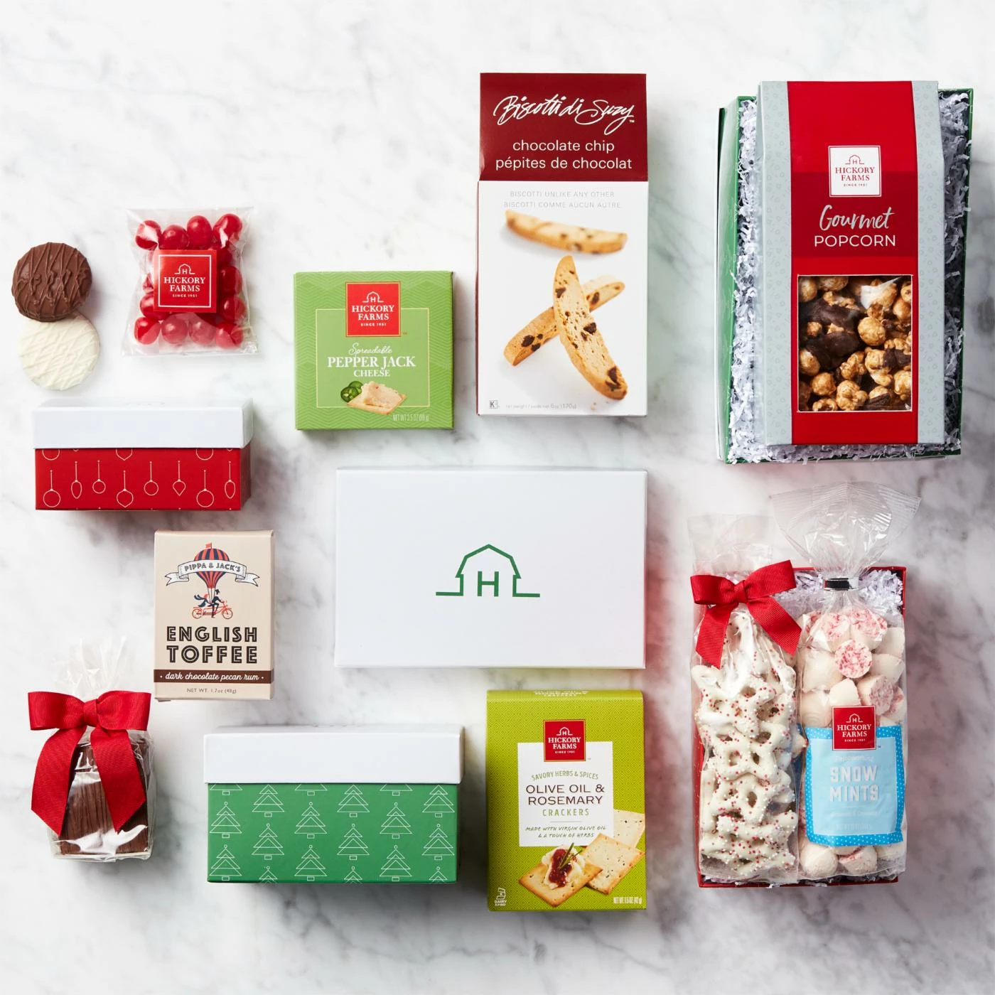 Say Merry Christmas in style with this elegant and cheerful gourmet gift. Specially-designed red and green boxes are filled with seasonal snacks for the whole family or office to enjoy, including caramel popcorn, chocolate-dipped graham crackers, cheese and crackers, and a whole lot more.