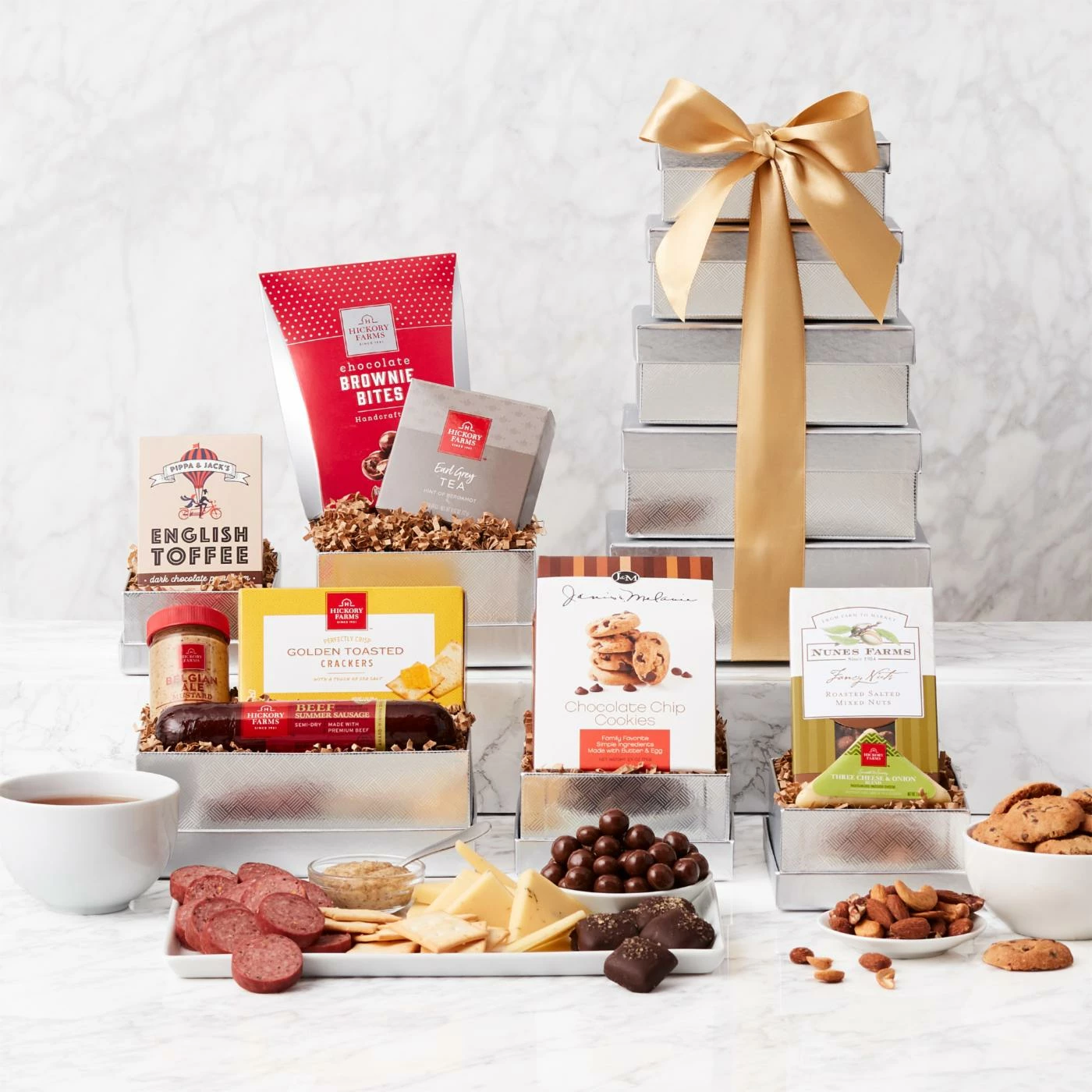 Tempt and treat them this holiday season with a shimmering silver tower overflowing with gourmet sweets and savory snacks! Each box is filled to the brim with tasty surprises, including delicious cookies, mouthwatering summer sausage, cheese, English toffee, and a whole lot more. This is a gift designed to delight and is perfect for friends, family members, and colleagues.