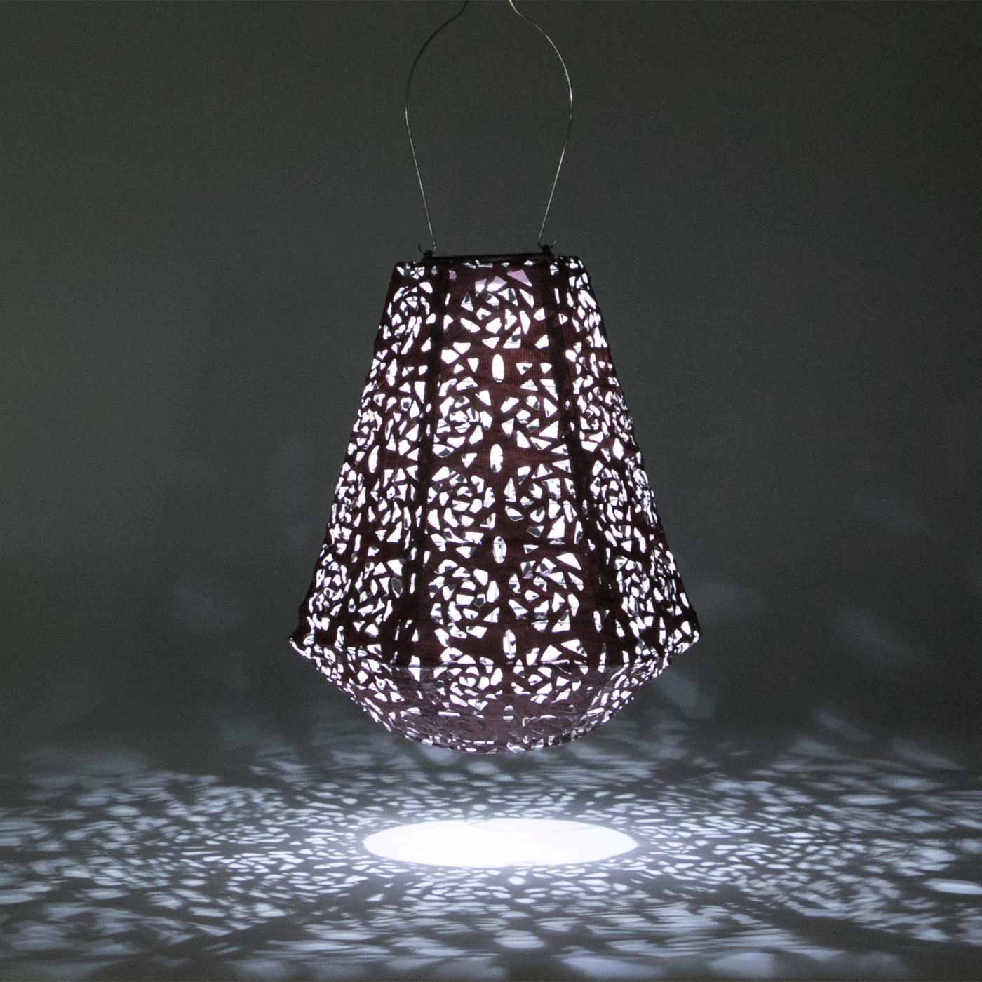 Add the Allsop Stella Metallic Orchid Prism Lantern to your space for a brilliant light display. This bulb-shaped lantern comes in a soft mauve color, reminiscent of blooms, while the punched-out pattern is distinctively floral, yet stylized. This solar-powered lantern has two LED lights that automatically turn on at dusk and off at dawn.