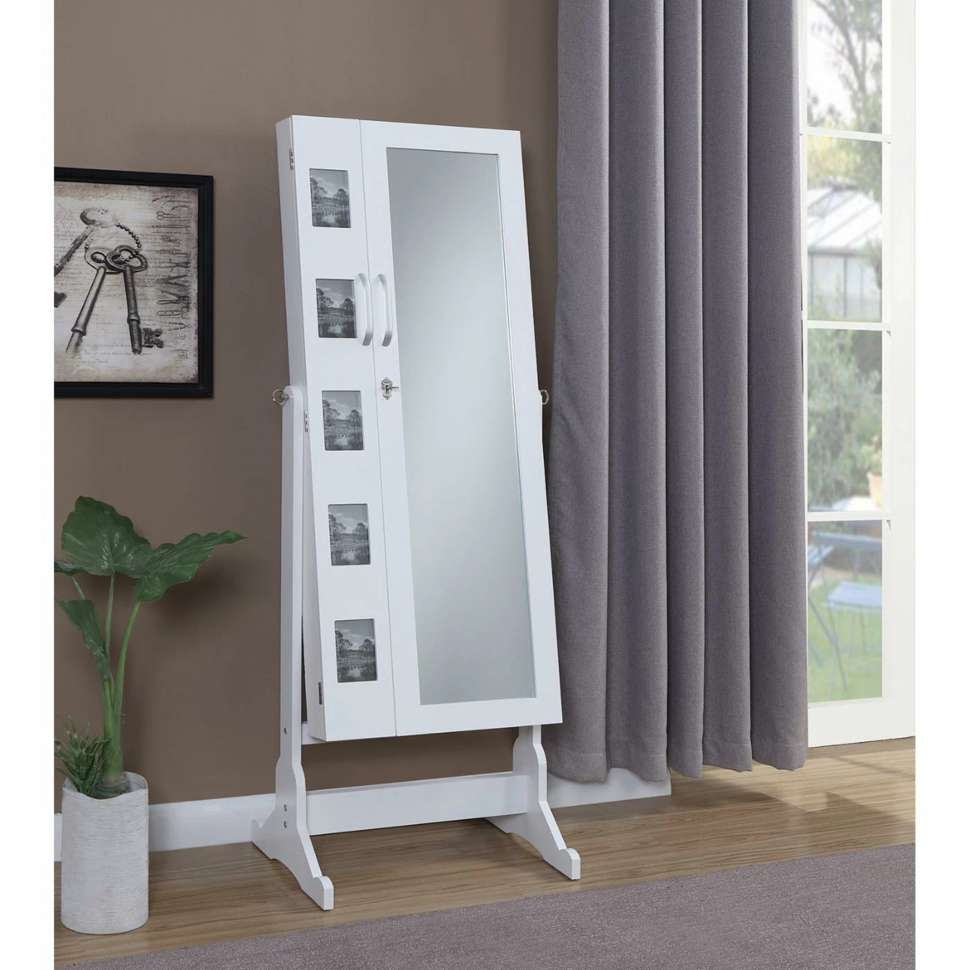 Keep your favorite jewelry well stored with the Coaster Furniture Jewelry Cheval Floor Mirror with Picture Frames – White. This versatile piece features a mirror and five picture frames on its exterior. Open the doors to reveal ample jewelry storage for all of your rings, bracelets, necklaces, watches, earrings, and other accessories. Store perfume bottles or nail polish on the little shelves and keeps larger items like scarves tucked away in the five drawers. A corkboard surface on the back of the door even allows you to pin up important notes or special photographs. The exterior features a classic white finish, and the interior includes a felt lining. Asian hardwood construction lends durability to this piece.