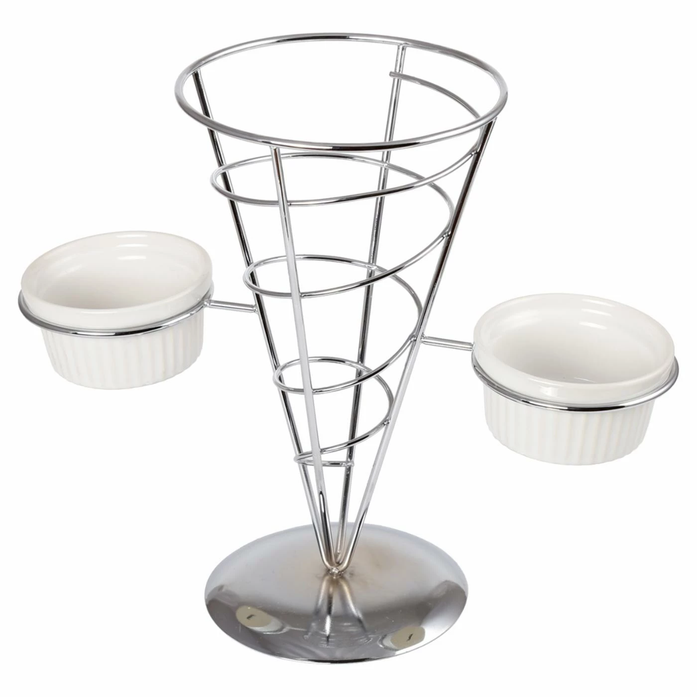 Kids will eat anything served in this cool Creative Home Chrome Works French Fry Set 9 x 5 x 8 1/2 in. includes 2 Ceramic Ramekins. Traditionally designed for pomme frites and dipping sauces โ although you can always get creative with what you serve โ this cone-shaped wire French fry holder includes two ceramic ramekins.