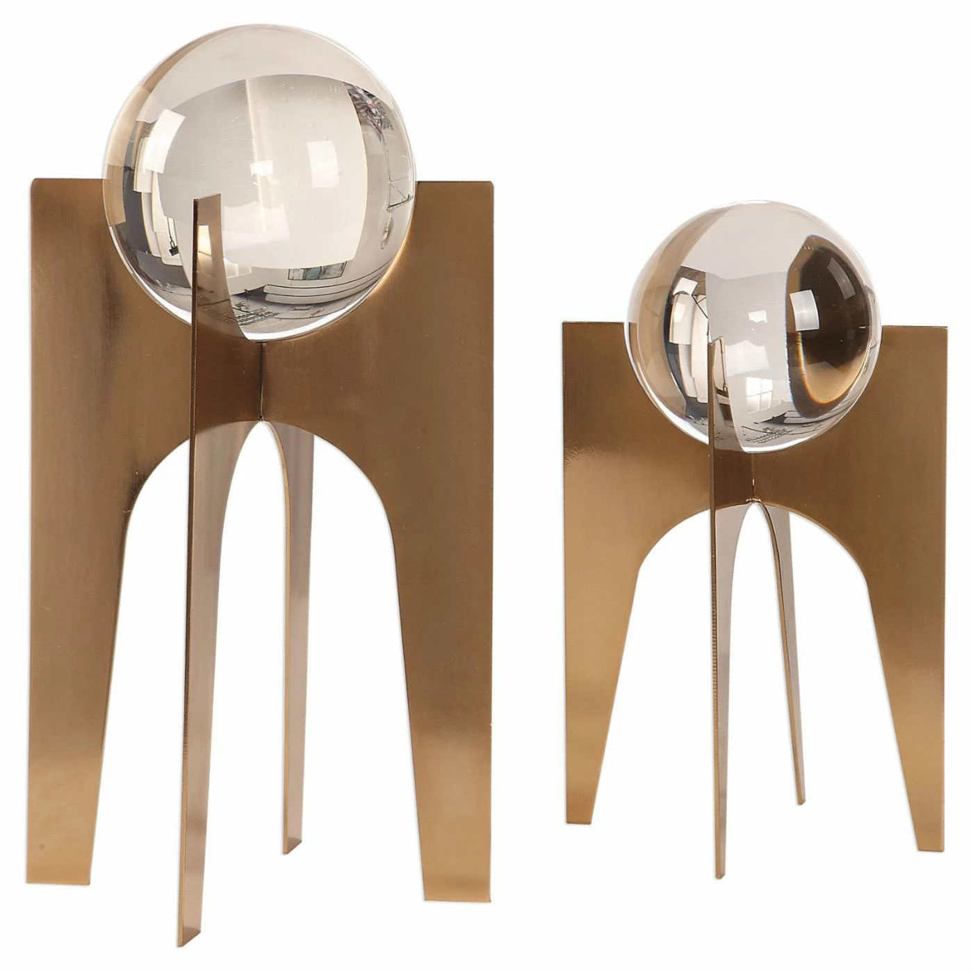 Add a futuristic accent to a side table or shelf with the HN Home Roland Mid-Century Modern Crystal Spheres – Set of 2. This sculpture features gleaming clear glass orbs mounted atop sleek stainless steel stands. A brushed copper finish brings rich visual warmth to the metal.
