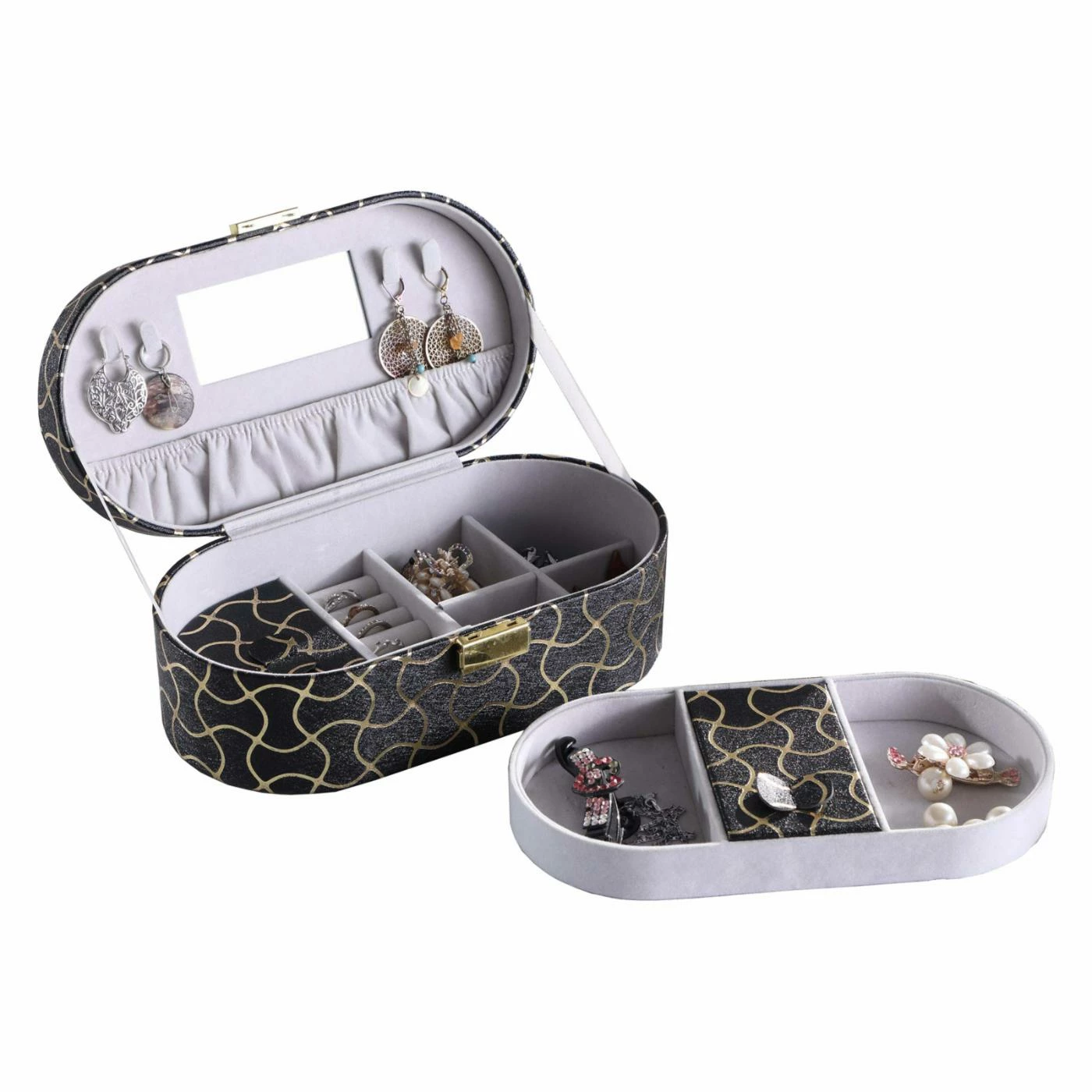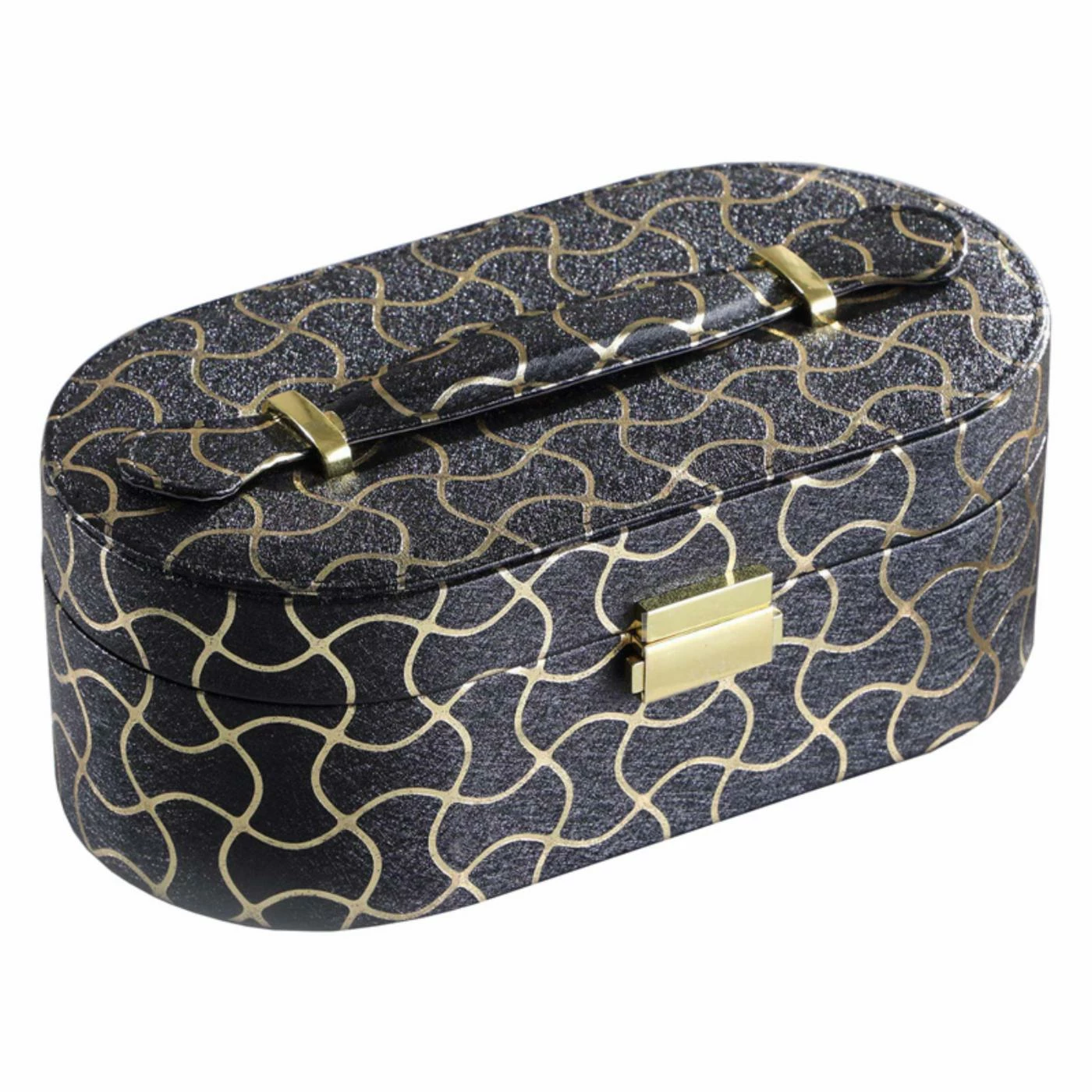 The ORE International Black Leather with Gold Swirl Piping Jewelry Case with Mirror Travel Case – 9.5W x 3.5H in. is a great way to keep all your jewelry organized and ready for travel. This case features a black faux leather exterior with gold accents. A removable tray provides open storage and a center pull tab covered middle compartment. Lower hidden storage gives you a space for necklaces and other items. The lid features a glass mirror as well as four hanging hooks and a handy jewelry pouch.