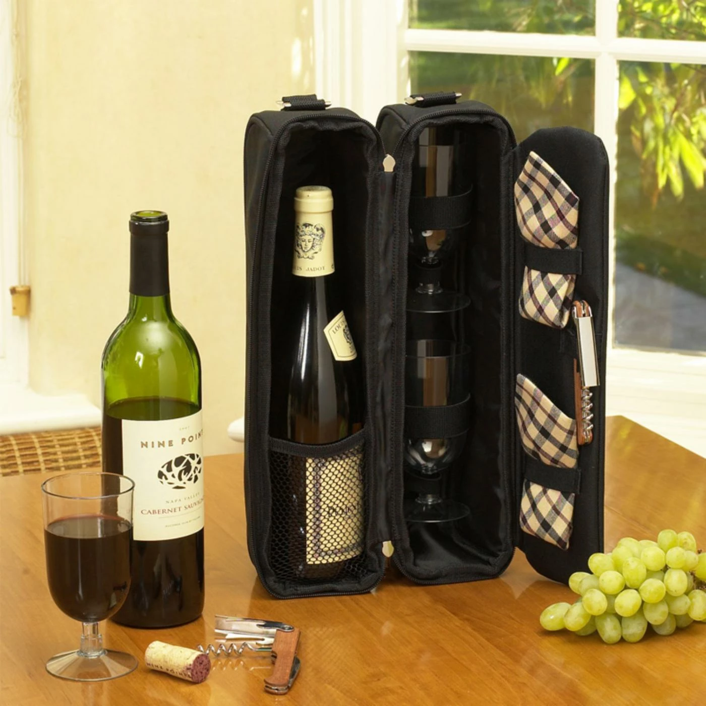 - Contains 2 glasses, napkins, and combination corkscrew