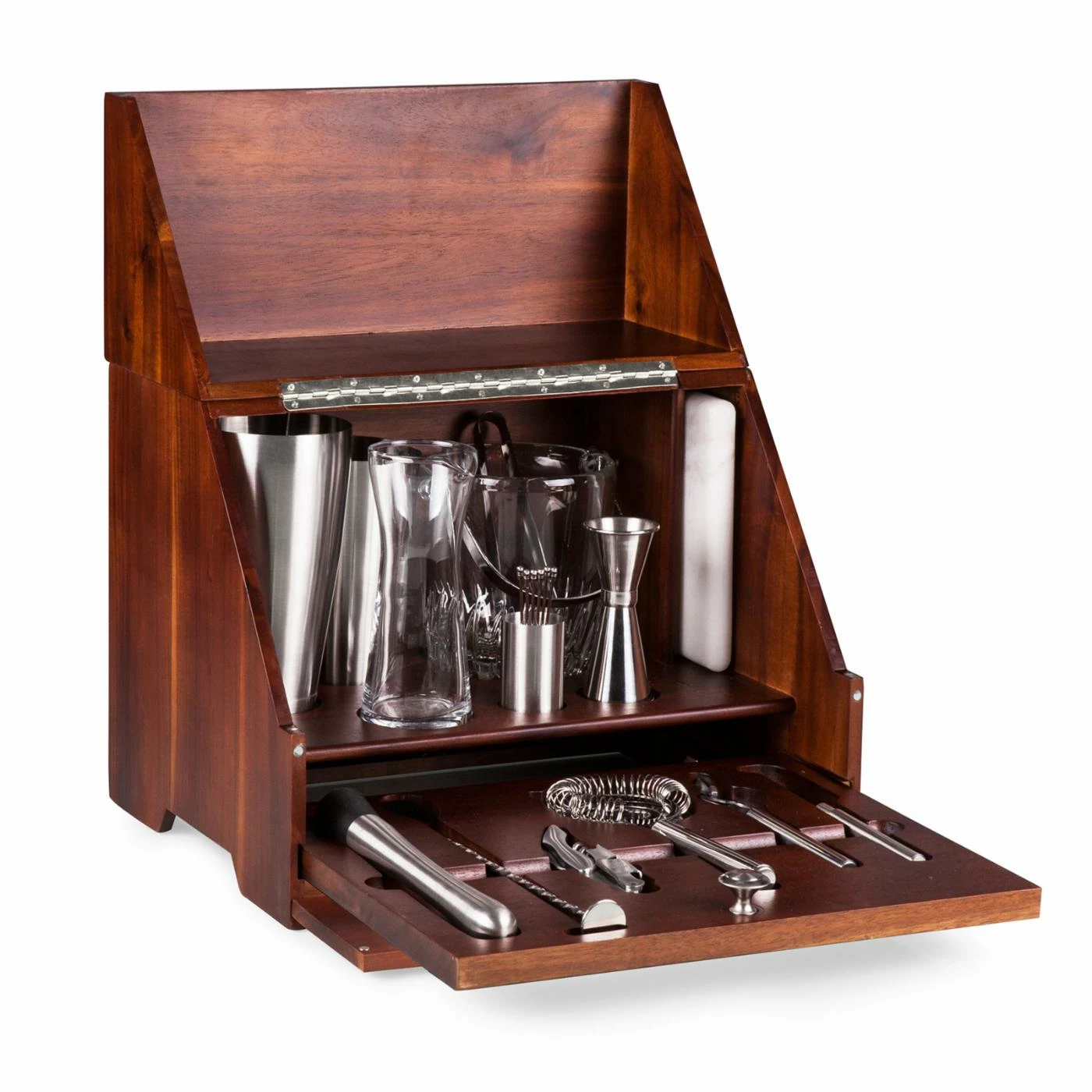With the Picnic Time Madison Travel Bar you have all the tools you need for perfect craft cocktails on the go. This complete travel bar set includes a variety of tools and glassware tucked within a cherry-stained acacia wood box. Its hinged design makes it easy to access everything. This set includes six stainless steel cocktail sticks, a stainless steel cocktail stick caddy, stainless steel Hawthorne strainer, stainless steel tongs, stainless steel bar spoon, stainless steel double-sided jigger, brushed stainless steel muddler with plastic head, stainless steel corkscrew, stainless steel two-piece shaker, stainless steel paring knife, stainless steel bottle opener, glass ice bucket with stainless steel handle, 8-oz. mixing glass with pour spout, and a luxurious marble cutting board. A perfect groomsmen gift!