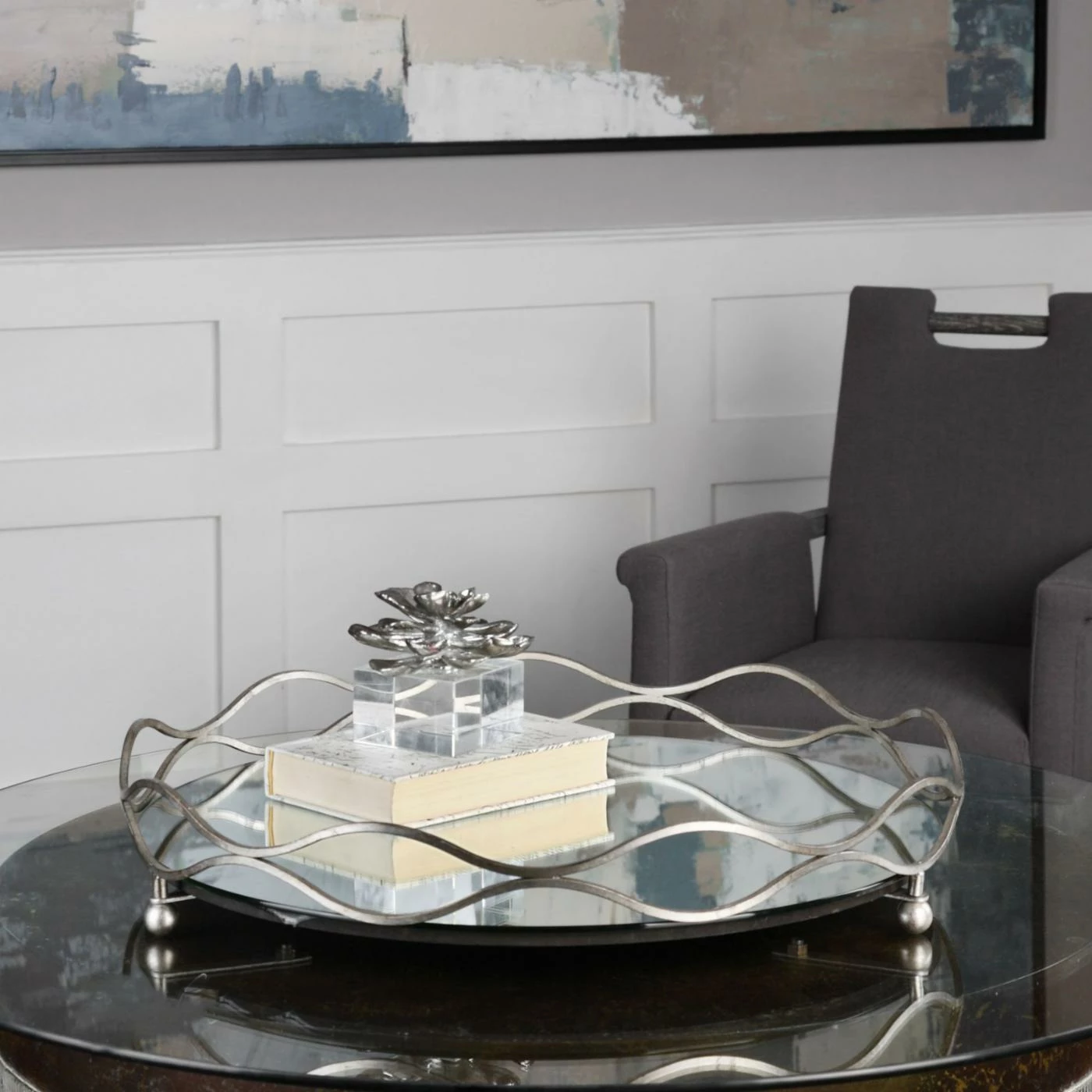 Gently curving steel surrounds the reflective mirrored interior of the Uttermost Rachele Tray for a look that’s gracefully chic. Ball feet lend extra height to this decorative tray that displays special figurines or perfume bottles in a beautiful way.