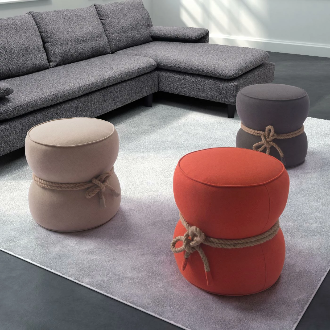 Whether grouped together or as a single splash of color, the Zuo Modern Tubby Pouf Ottoman is designed to delight. Fully upholstered in a felt-like poly-blend fabric in smart color options. This ottoman is accented by chic nautical rope trim that cinches the middle creating a hourglass shape. Brilliant in a nursery, childrenβs rooms, or as extra seating in the living or family room.